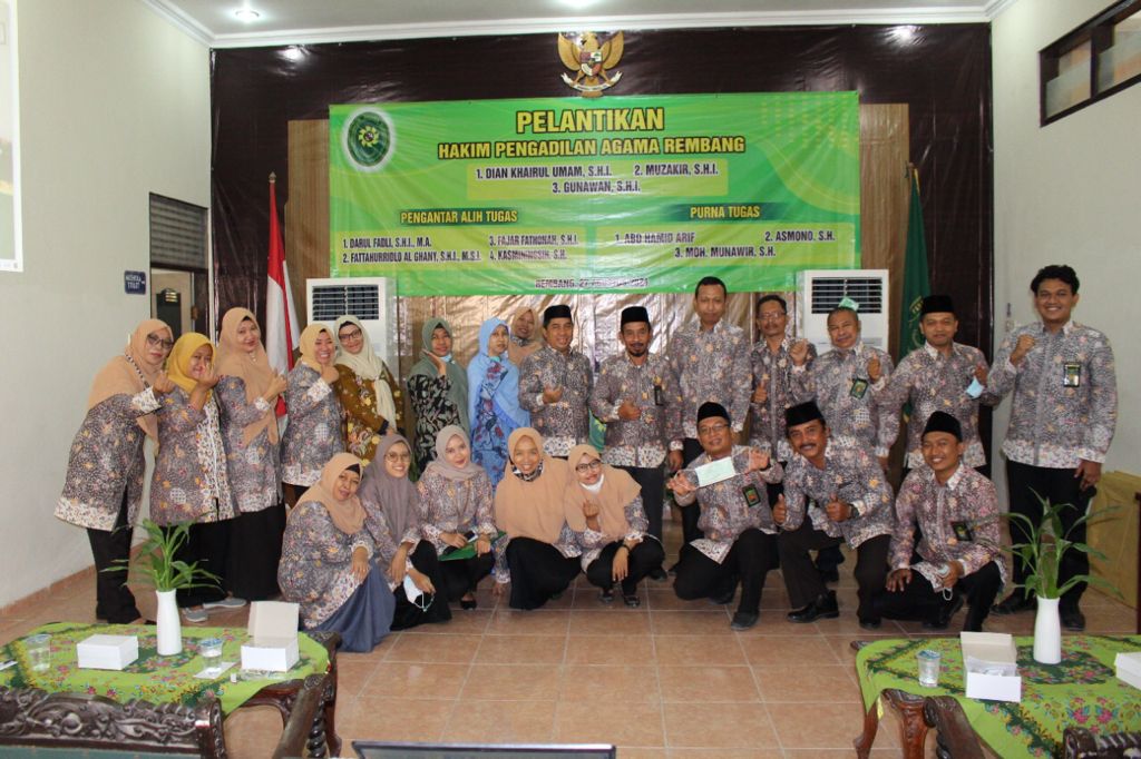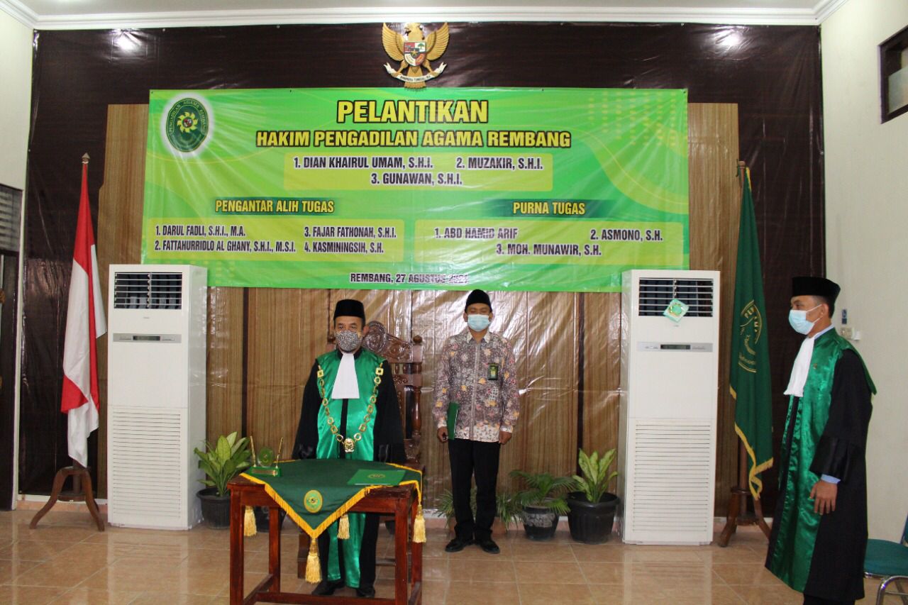 Rembang | Jum’at, 27 Agustus 2021 dilaksanakan pelantikan hakim secara luring dan daring, pengantar alih tugas serta purna tugas di PA Rembang. Acara pelantikan Hakim yang pada awalnya akan dilaksanakan secara luring, tetapi karena terdapat 2 (dua) Hakim yang tidak dapat mengikuti dikarenakan jarak ke satuan kerja yang jauh dan adanya pemberlakuan PPKM darurat, pada akhirnya dilaksanakan secara paralel antara luring dan daring melalui aplikasi zoom meeting. Hakim yang mengikuti acara pelantikan secara luring yaitu Bapak Dian Khairul Umam, S.H.I dari PA Tabanan Kelas II. Sedangkan Hakim yang mengikuti Pelantikan secara daring yaitu Bapak Muzakir, S.H.I dari PA Balige Kelas II dan Bapak Gunawan, S.H.I dari PA Kota Banjar Kelas II.