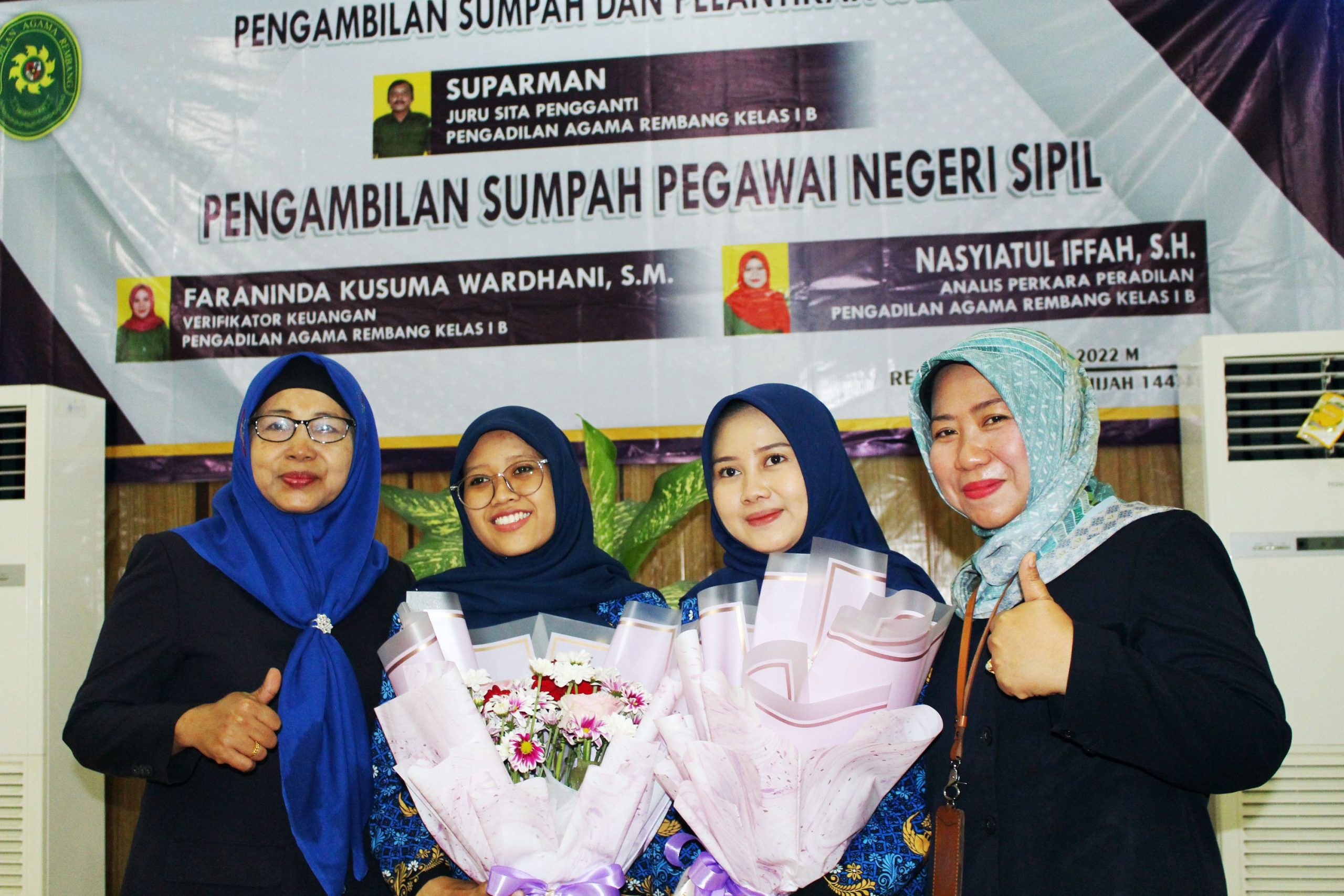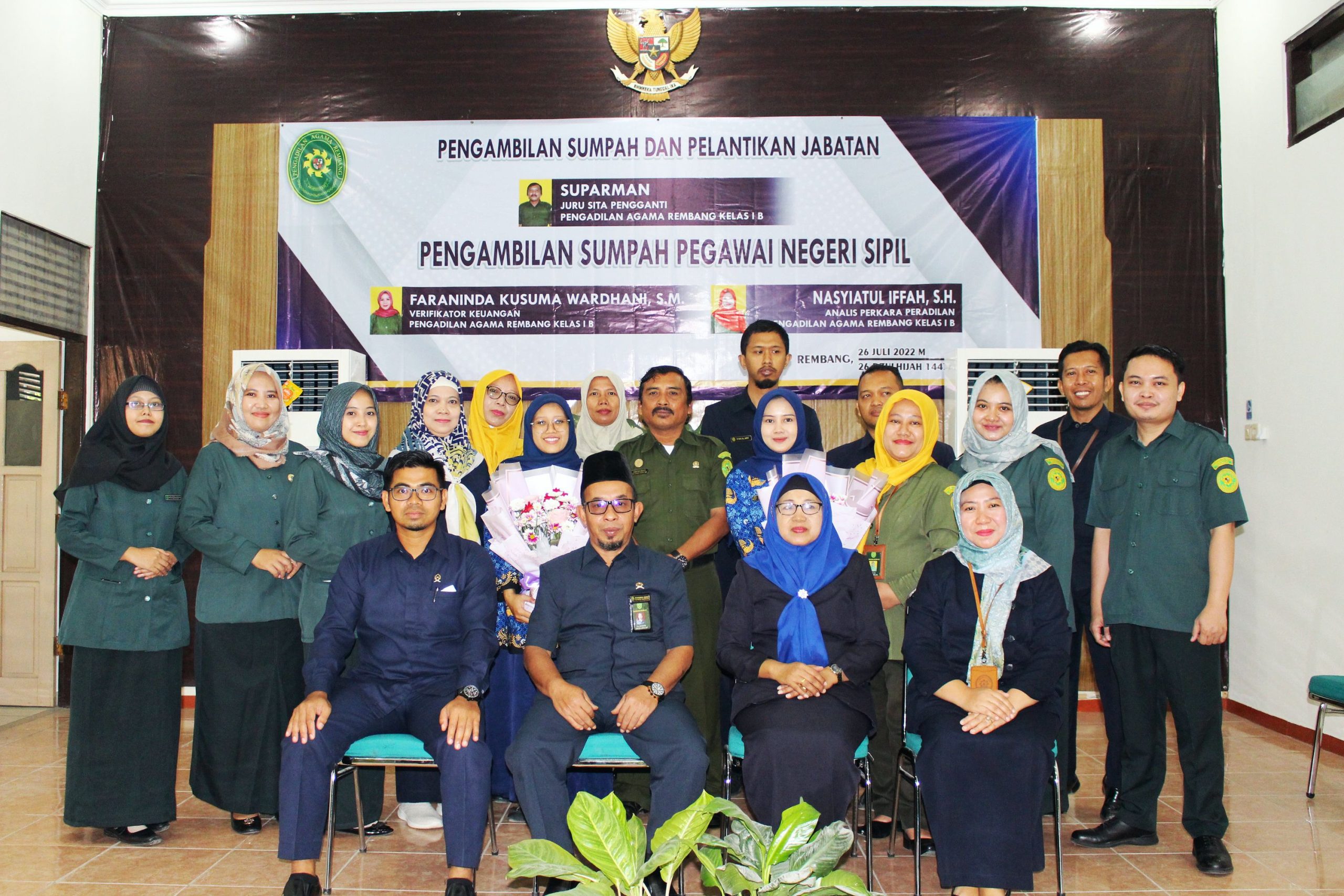 Rembang – Selasa, 26 Juli 2022 | Bertempat di Ruang Aula Pengadilan Agama Rembang, pada hari Selasa, 26 Juli 2022 dilaksanakan Pelantikan dan Pengambilan Sumpah Pegawai Negeri Sipil (PNS) kepada Faraninda Kusuma Wardhani, S.M. (CPNS Verifikator Keuangan) dan Nasyiatul Iffah, S.H., (CPNS Analis Perkara Peradilan) setelah melewati masa percobaan selama 1 tahun 7 bulan sebagai Calon Pegawai Negeri Sipil, serta Pelantikan dan Pengambilan Sumpah Jurusita Pengganti kepada Suparman.
