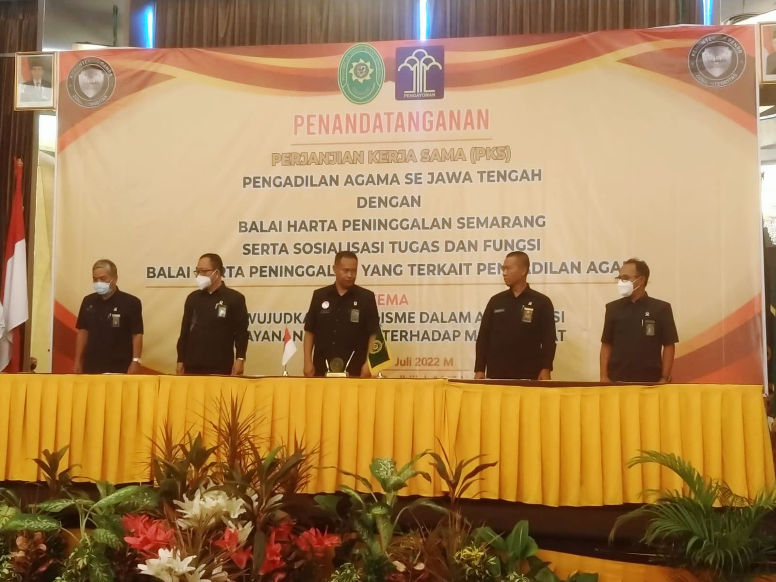 Semarang – Rabu (27/7/2022), Bertempat di Ballroom Lantai 1 Hotel Quest, Semarang, dilaksanakan Penandatanganan Perjanjian Kerjasama antara Pengadilan Agama Se-Jawa Tengah dengan Balai Harta Peninggalan (BHP) Semarang serta Sosialisasi Tugas dan Fungsi Balai Harta Peninggalan yang terkait Pengadilan Agama. Acara ini mengangkat tema Mewujudkan Sinergisme Dalam Akselerasi Pelayanan Keadilan Terhadap Masyarakat.