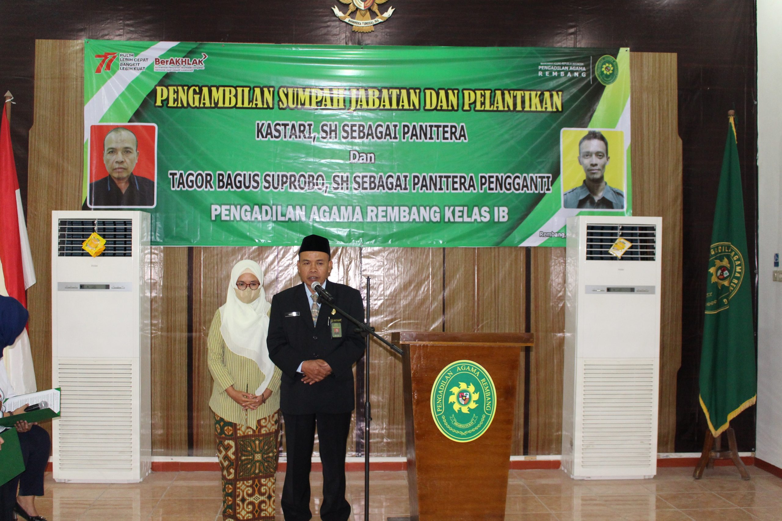 Panitera yang dilantik adalah Bapak Kastari,S.H. yang sebelumnya adalah Panitera Muda Permohonan Pengadilan Agama Pemalang, serta Panitera Pengganti yang dilantik adalah Bapak Tagor Bagus Suprobo,S.H. yang sebelumnya adalah Analis Perkara Peradilan di Pengadilan Agama Surakarta. Pelantikan berjalan khidmat dan lancar. Setelah acara pelantikan selesai, dilanjutkan dengan perkenalan dari pejabat yang baru dilantik dan dilanjutkan dengan sambutan dari Ketua PA Rembang. Dalam sambutannya Ketua PA Rembang mengucapkan selamat datang kepada Panitera dan Panitera Pengganti yang baru saja dilantik. Ketua PA Rembang berharap kepada Panitera dan Panitera Pengganti yang baru untuk bisa dengan cepat menyesuaikan diri di PA Rembang. Acara ini kemudian ditutup dengan ucapan selamat dan foto bersama.