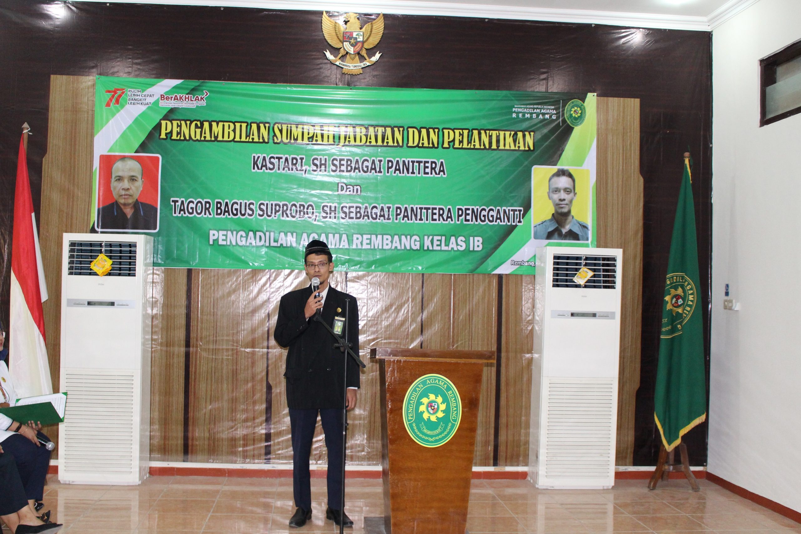 Acara pelantikan tersebut dipimpin oleh Ketua Pengadilan Agama Rembang Drs.Zakiruddin yang diawali dengan pembacaan doa, kemudian dilanjutkan dengan menyanyikan lagu Indonesia Raya serta Hymne Mahkamah Agung.