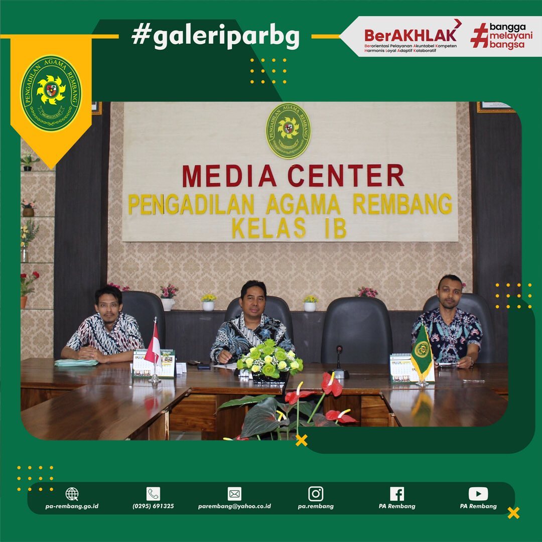 Bertempat di Ruang Media Center PA Rembang, Wakil Ketua, Hakim dan Panitera Pengganti PA Rembang mengikuti acara Penandatanganan MoU antara Ditjen Badilag dengan Kemenag RI secara virtual. Penandatanganan MoU ini dimaksudkan mengenai “Integrasi dan Pemanfaatan Data Perkawinan dan Perceraian”.