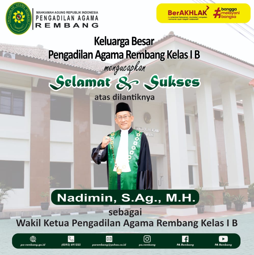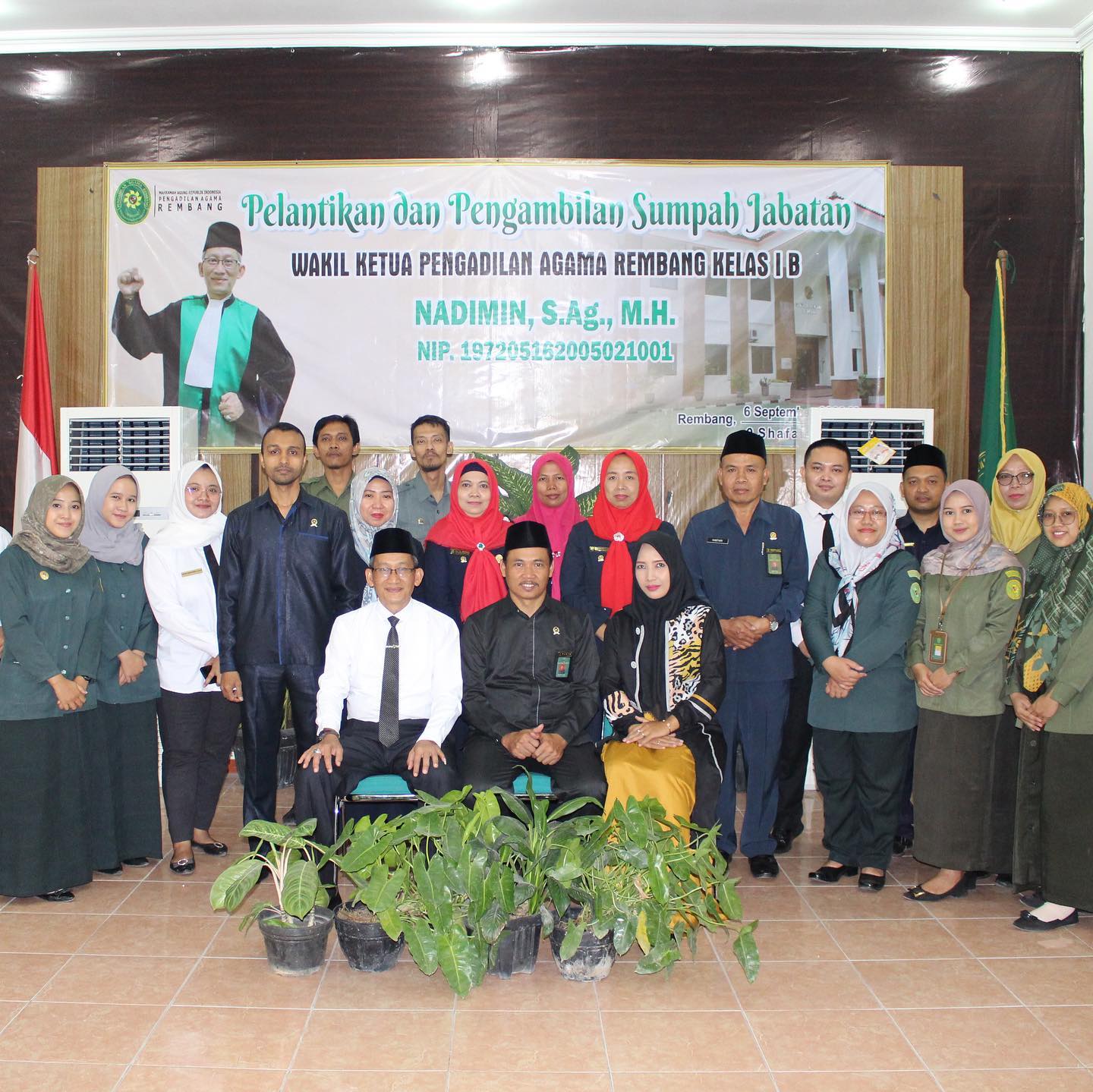 Rembang | Pada hari Selasa, 6 September 2022 diselenggarakan acara Pengambilan Sumpah Jabatan dan Pelantikan Wakil Ketua Pengadilan Agama Rembang. Bapak M. Safi’i, S.Ag. selaku Ketua Pengadilan Agama Rembang melantik Bapak Nadimin, S.Ag., M.H. sebagai Wakil Ketua Pengadilan Agama Rembang. Acara dimulai tepat pukul 09.00 WIB yang bertempat di Ruang Aula Pengadilan Agama Rembang. Pada pelantikan ini hadir seluruh aparatur Pengadilan Agama Rembang baik Pejabat Struktural, Pejabat Fungsional, Pelaksana, PPNPN, serta tamu undangan.