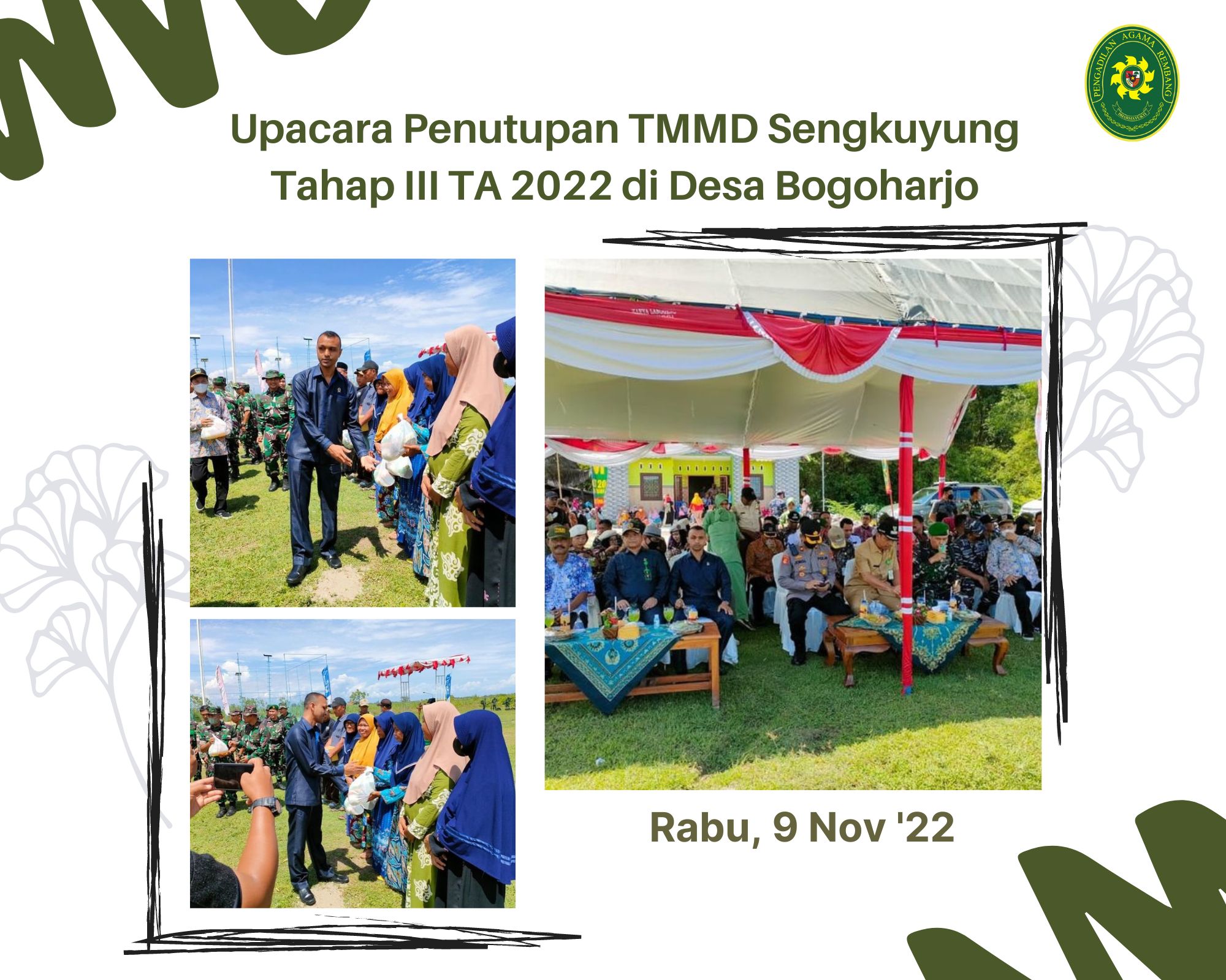 Rembang (09/11) | Memenuhi Undangan dari Dandim 0720/Rembang, PA Rembang Menghadiri Upacara Penutupan TMMD Sengkuyung Tahap III TA. 2022. Bertempat di Lapangan Sepak Bola Desa Bogoharjo, Kecamatan Kaliori, Kabupaten Rembang, turut hadir dari PA Rembang yaitu Hakim, Muzakir, S.H.I.