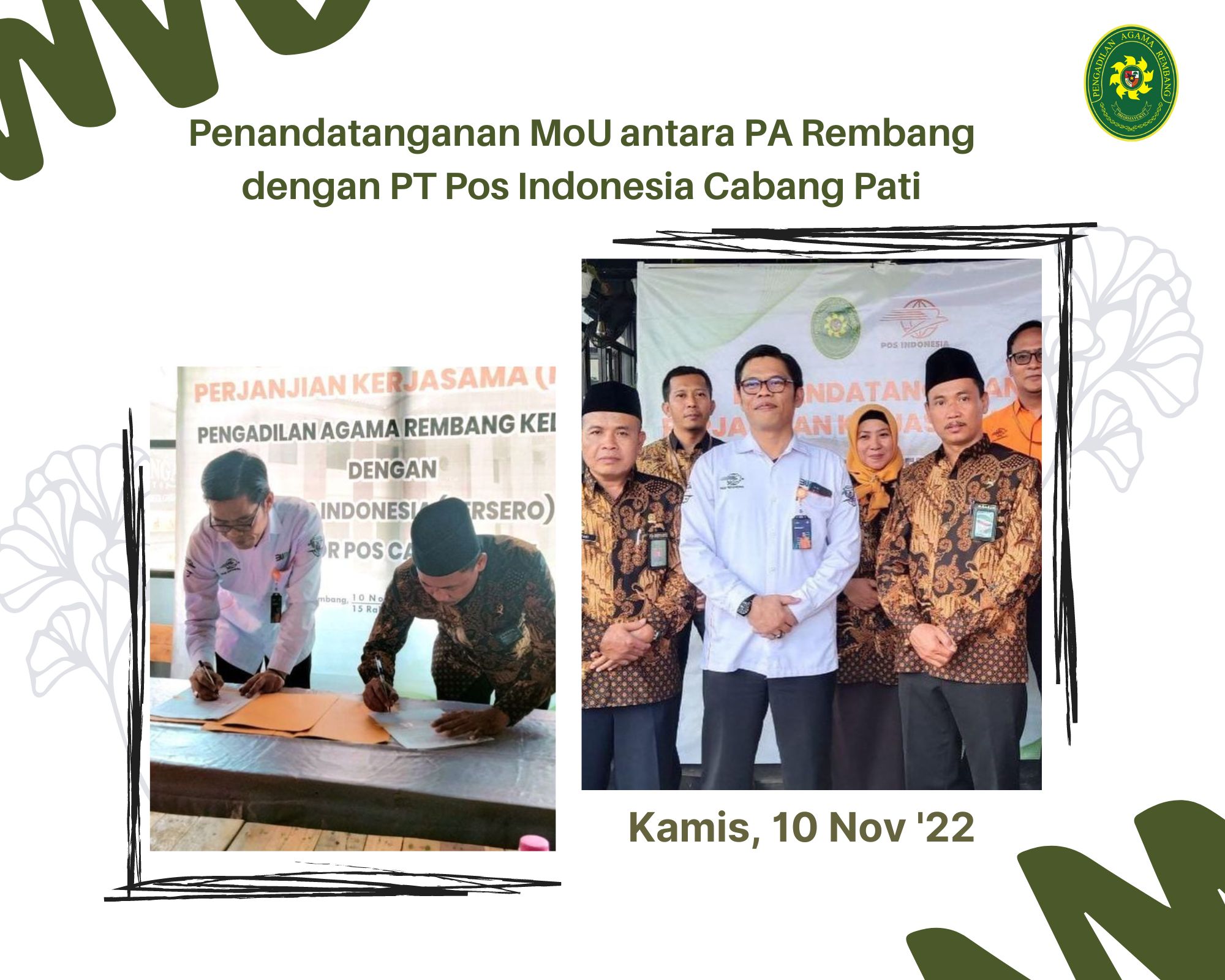 Pati (10/11) | Penandatanganan Nota Kesepahaman (MoU) ini sebagai tindak lanjut dari penandatangan Berita Acara Kesepakatan (BAK) yang telah dilaksanakan sebelumnya. MoU ditandatangani langsung oleh Ketua PA Rembang, M. Safi’i, S.Ag dan Kepala Kantor Pos Cabang Pati, Arif Budi Hartanto bertempat di Khayangan Rooftop Cafe Pati. Hadir pula dalam acara yaitu Panitera, Sekretaris, dan Kasubbag Umum dan Keuangan serta perwakilan dari Kantor Pos Cabang Pati.