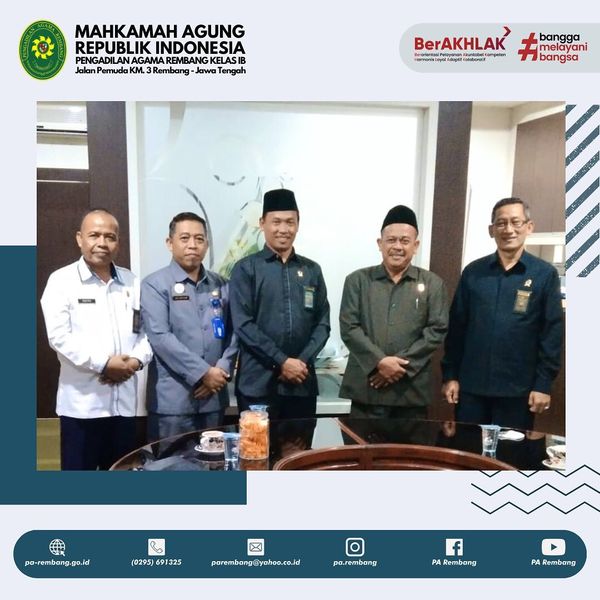 Rembang (28/11) | Ketua, Wakil Ketua, dan Panitera Pengadilan Agama Rembang melakukan kunjungan kerja ke kantor DPRD Kabupaten Rembang dalam rangka silaturahmi dan mempererat hubungan kerja sama. Jajaran pimpinan Pengadilan Agama Rembang disambut hangat oleh Ketua DPRD Kabupaten Rembang, H. Supadi, bertempat di Kantor DPRD Kabupaten Rembang.