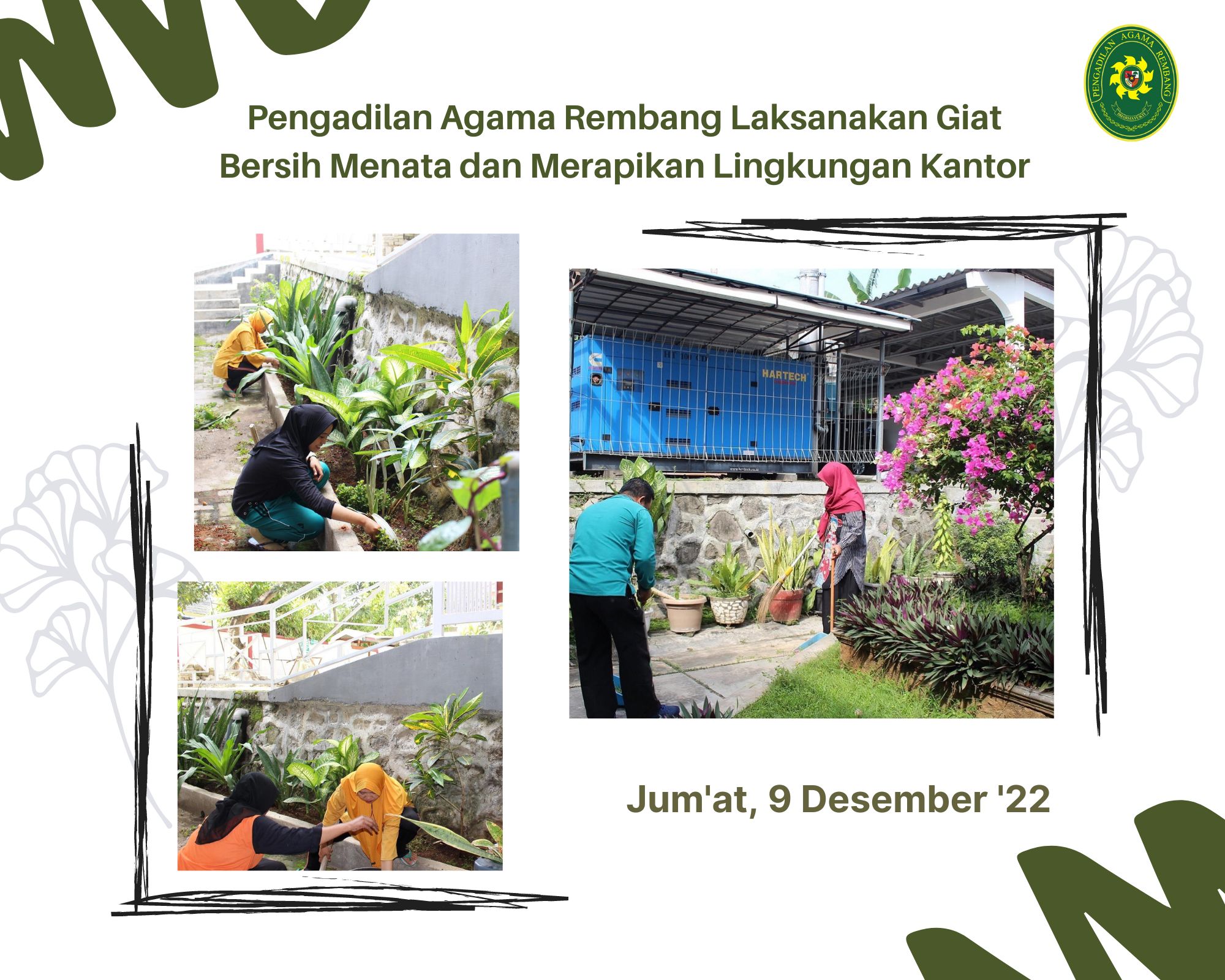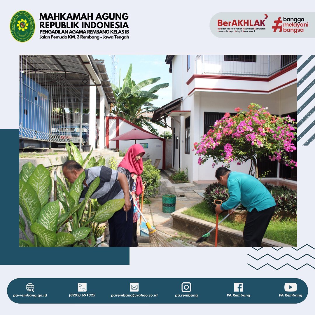 Rembang (09/12) | Seluruh aparatur Pengadilan Agama Rembang bersemangat melaksanakan giat bersih di lingkungan kantor. Giat bersih kali ini berfokus pada penataan taman dan ruang pelayanan publik demi terwujudnya lingkungan yang bersih dan nyaman untuk mendukung terwujudnya pelayanan yang prima kepada pencari keadilan.