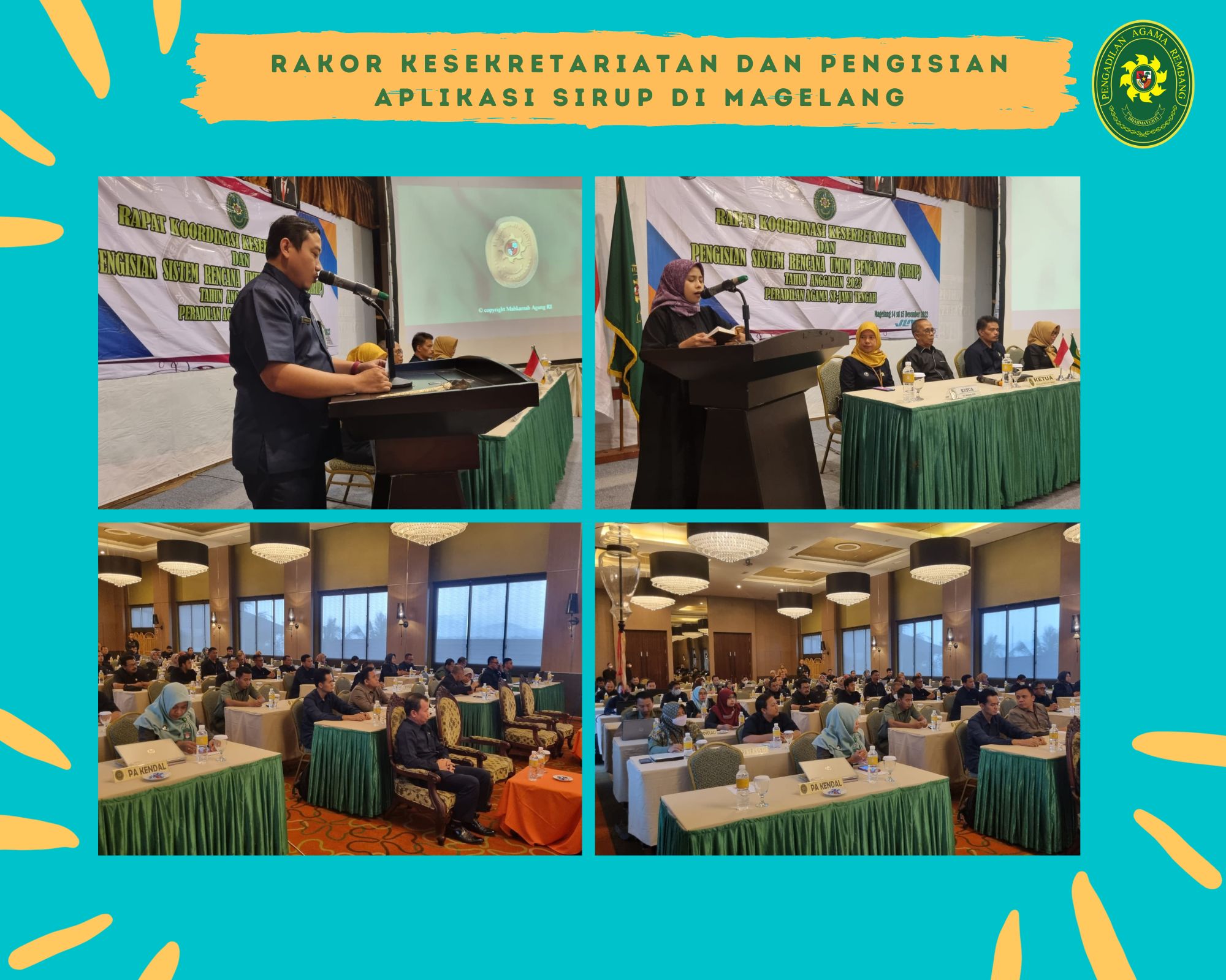 Magelang | Bertempat di The Oxalis Regency Hotel Magelang, PTA Semarang menyelenggarakan Rapat Koordinasi Kesekretariatan dan Pengisian Aplikasi SIRUP yang dihadiri oleh Sekretaris dan Operator SIRUP PA Se-Jawa Tengah. Acara ini diselenggarakan mulai tanggal 14 s.d 15 Desember 2022. Turut hadir sebagai perwakilan dari PA Rembang yakni Ibu Siti Nor Safa’atun, S.Th.I selaku Sekretaris PA Rembang serta Faraninda Kusuma Wardhani, S.M selaku Operator SIRUP PA Rembang.