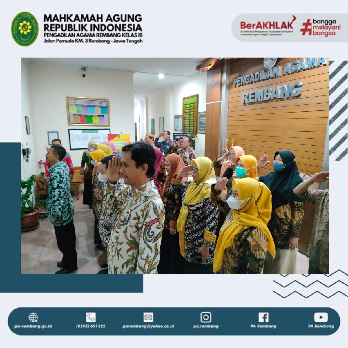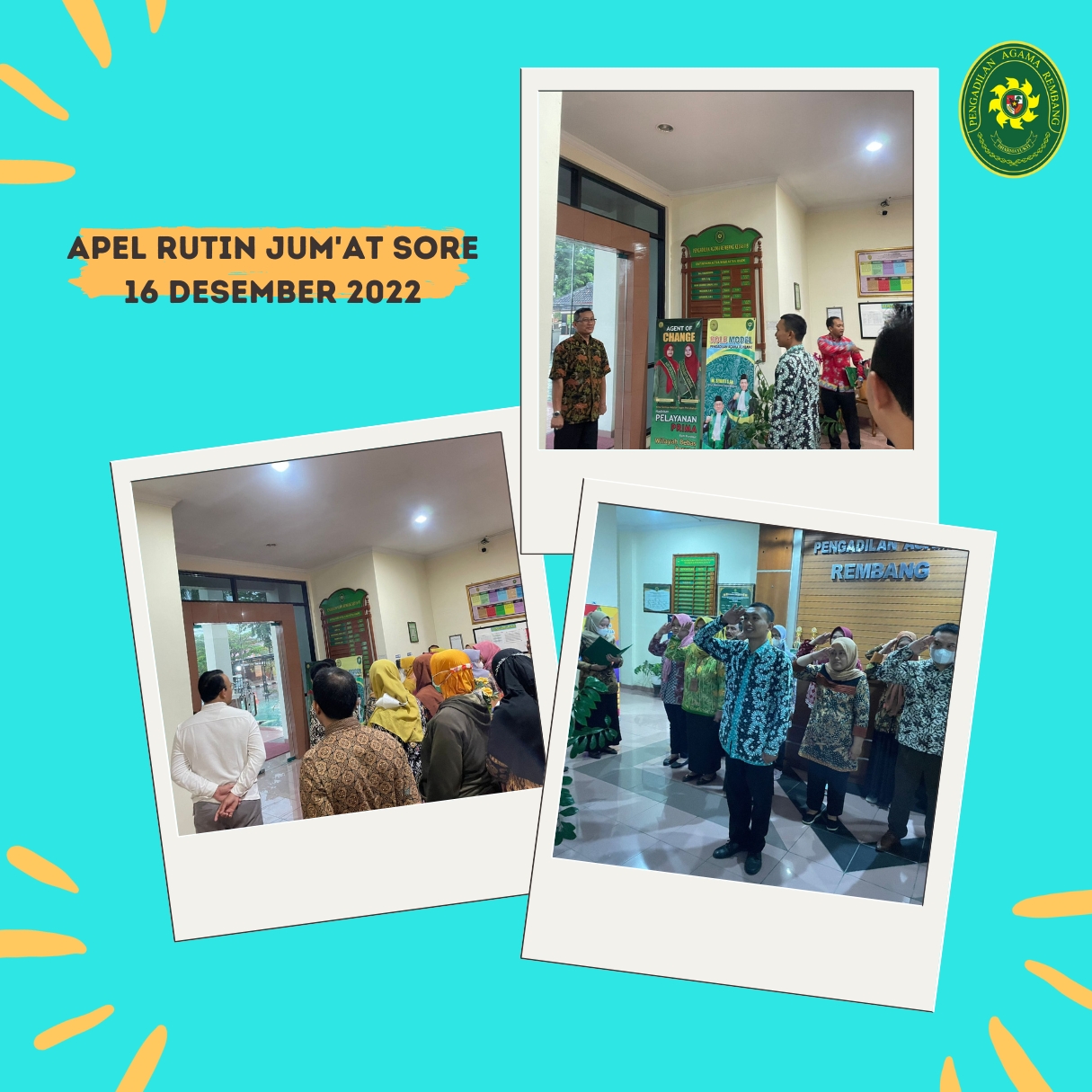 Rembang (16/12) Kondisi cuaca yang tidak menentu tidak menyurutkan niat Aparatur Pengadilan Agama Rembang untuk tetap melaksanakan apel rutin Jumat sore. Apel Jumat sore kali ini dilaksanakan bertempat di lobby kantor PA Rembang dikarenakan kondisi cuaca yang sedang hujan deras sehingga tidak memungkinkan untuk melaksanakan apel di halaman kantor. Berkesempatan pada apel sore hari ini dengan Pembina yaitu Wakil Ketua PA Rembang, Bapak Nadimin, S.Ag., M.H.