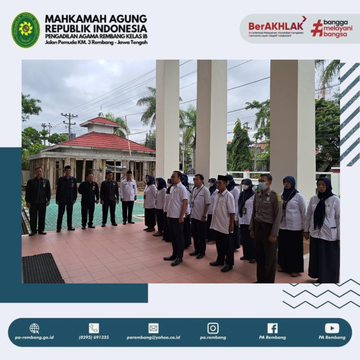 Rembang (26/12) Pengadilan Agama Rembang laksanakan apel rutin Senin Pagi yang bertempat di halaman kantor. Berkesempatan pada apel pagi hari ini dengan Pembina yaitu YM Wakil Ketua PA Rembang, Bapak Nadimin, S.Ag., M.H. Dalam amanatnya, beliau menyampaikan bahwa di penghujung tahun 2022 ini harapannya semua Aparatur PA Rembang bekerjasama dalam menyelesaikan semua laporan yang harus selesai akhir tahun ini, serta beliau berterima kasih atas kerjasamanya selama setahun ini. Semoga kedepannya dapat ditingkatkan lagi kerjasama antar berbagai lini di PA Rembang untuk mewujudkan Visi dan Misi dari PA Rembang dan Mahkamah Agung RI.