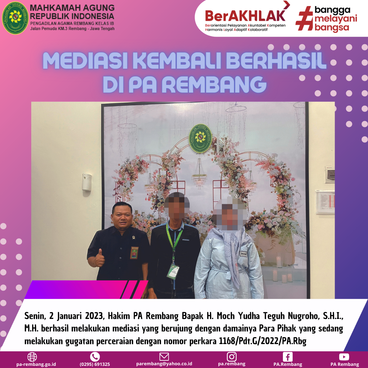 Rembang (02/01) Hakim PA Rembang Bapak H. Moch Yudha Teguh Nugroho, S.H.I.,M.H selaku hakim mediator melakukan mediasi pada Pihak yang sedang melakukan gugatan perceraian, dengan Perkara yang tercatat pada register Kepaniteraan PA Rembang dengan nomor: 1168/Pdt.G/2022/PA.Rbg. Hasil dari mediasi ini adalah kesepakatan perdamaian antara kedua belah pihak. Mediasi berhasil kali ini adalah yang pertama pada tahun 2023. Pada tahun 2022, PA Rembang juga telah banyak berhasil melakukan mediasi dengan hasil damainya kedua belah pihak. Semoga di Tahun 2023 ini semakin banyak mediasi yang berhasil, sehingga berkurangnya masyarakat yang cerai di Kabupaten Rembang.