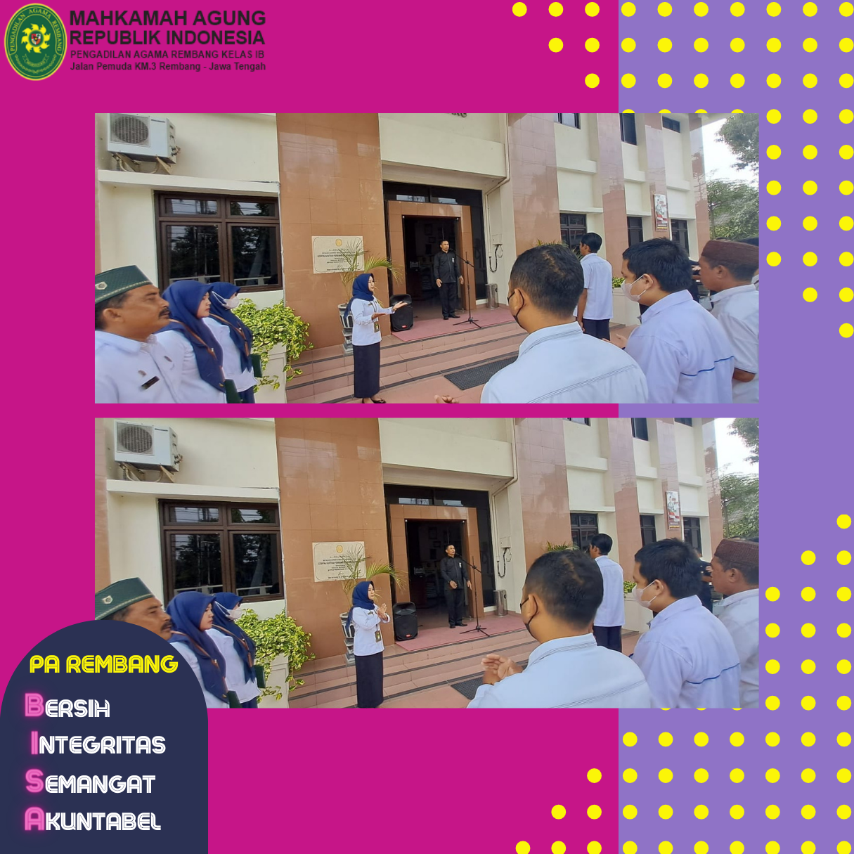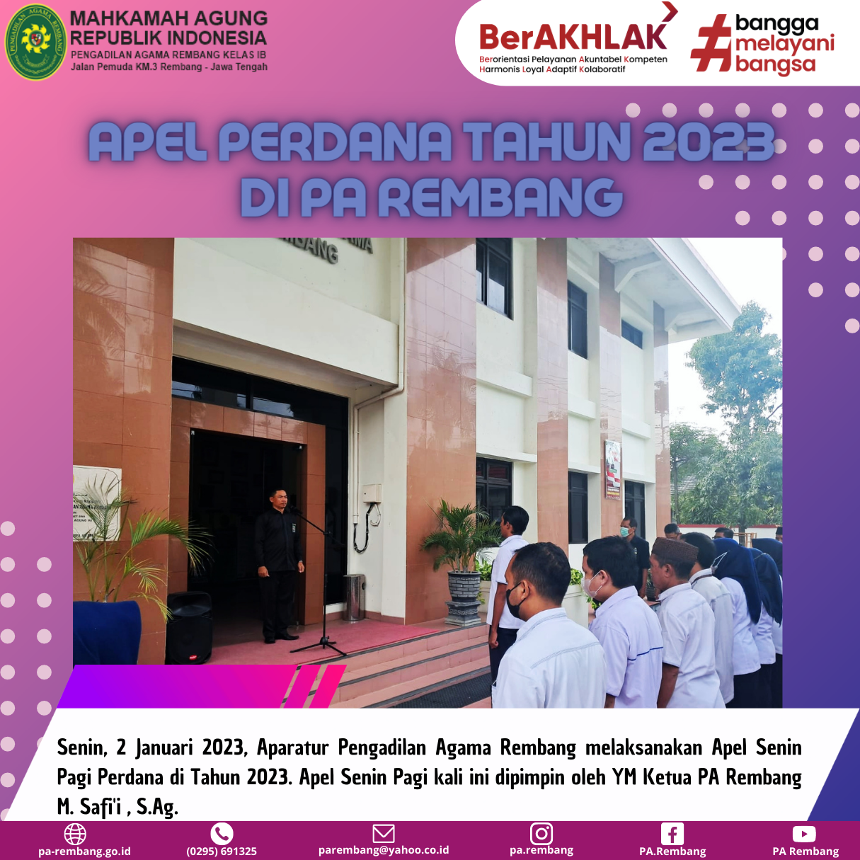 Rembang (02/01) Pengadilan Agama Rembang laksanakan apel rutin Senin Pagi yang bertempat di halaman kantor Pengadilan Agama Rembang. Apel Senin pagi kali ini merupakan apel perdana mengawali tahun 2023.