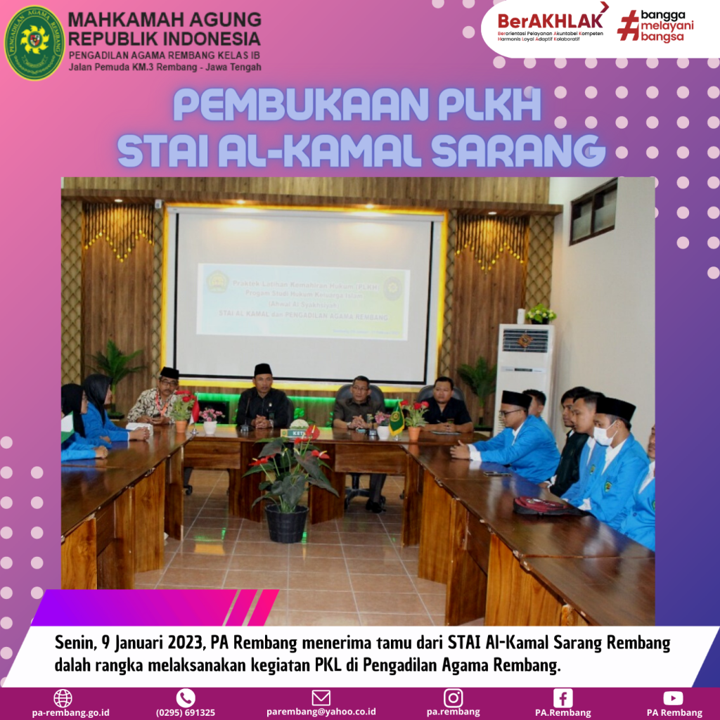 Senin, 9 Januari 2023, bertempat di Ruang Aula PA Rembang dilaksanakan kegiatan Pembukaan Praktik Latihan Kemahiran Hukum (PLKH) Mahasiswa Prodi Studi Hukum Keluarga Islam dari STAI Al Kamal, Sarang, Kabupaten Rembang. Dalam kesempatan ini hadir Ketua STAI Al Kamal Bapak H. Moch. Noor Hasan, M.H beserta Dosen Pembimbing Lapangan (DPL) Bapak M. Isa Ansori dan Bapak Ali Hadi serta para peserta kegiatan PLKH yang disambut oleh Ketua, Wakil, Hakim, Panitera, dan Sekretaris PA Rembang. Kegiatan PLKH ini dijadwalkan dimulai tanggal 9 Januari s.d 9 Februari 2023 di Pengadilan Agama Rembang yang akan diikuti oleh 15 orang mahasiswa dari STAI Al Kamal Sarang