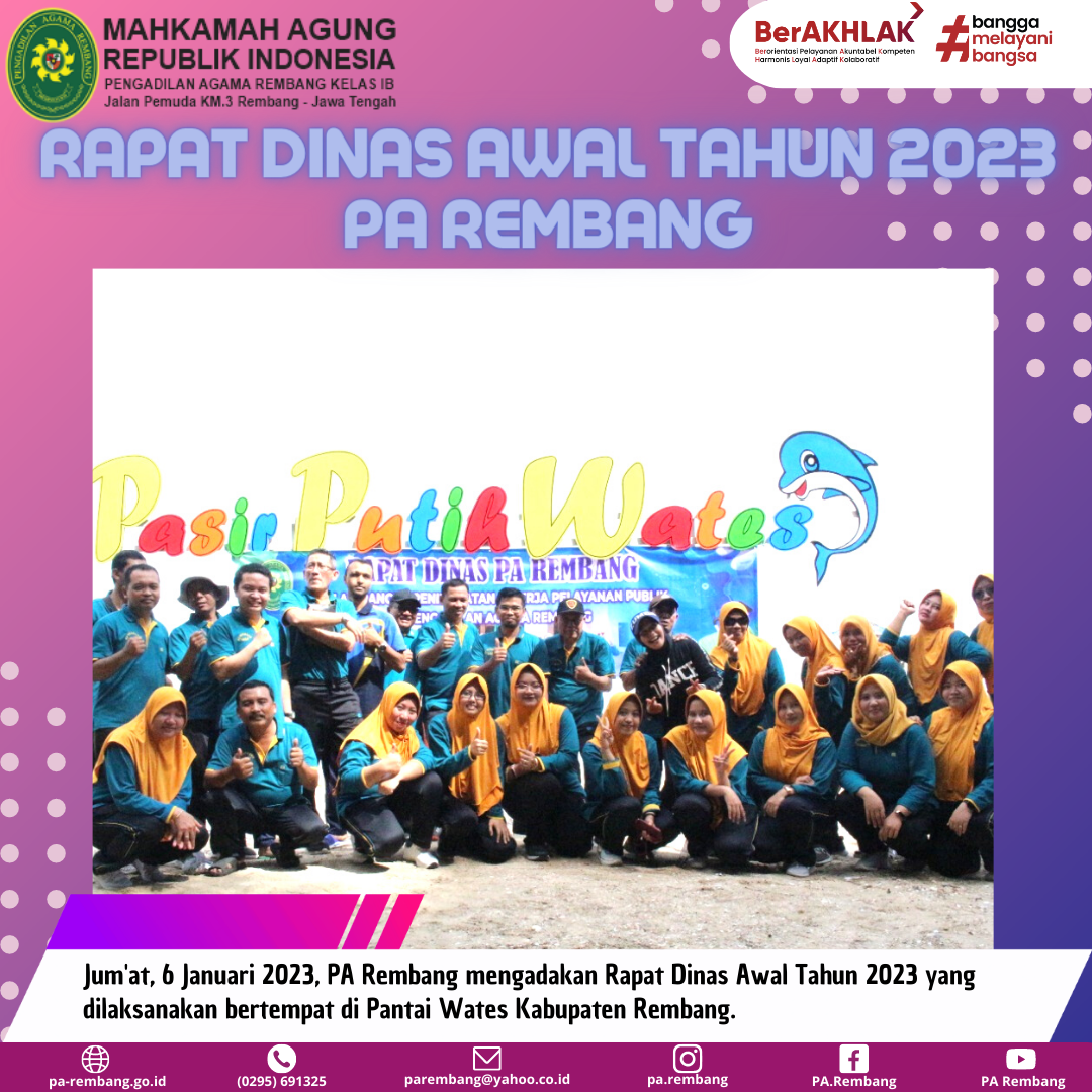 Jum’at, 6 Januari 2023, PA Rembang melaksanakan Rapat Dinas Awal Tahun 2023 bertempat di Pantai Wates Kabupaten Rembang. Acara dimulai pukul 08.00 WIB s.d 12.00 WIB dan dihadiri oleh seluruh jajaran Pimpinan, Hakim, Pejabat Kesekretariatan dan Kepaniteraan, Staf, dan PPNPN PA Rembang.