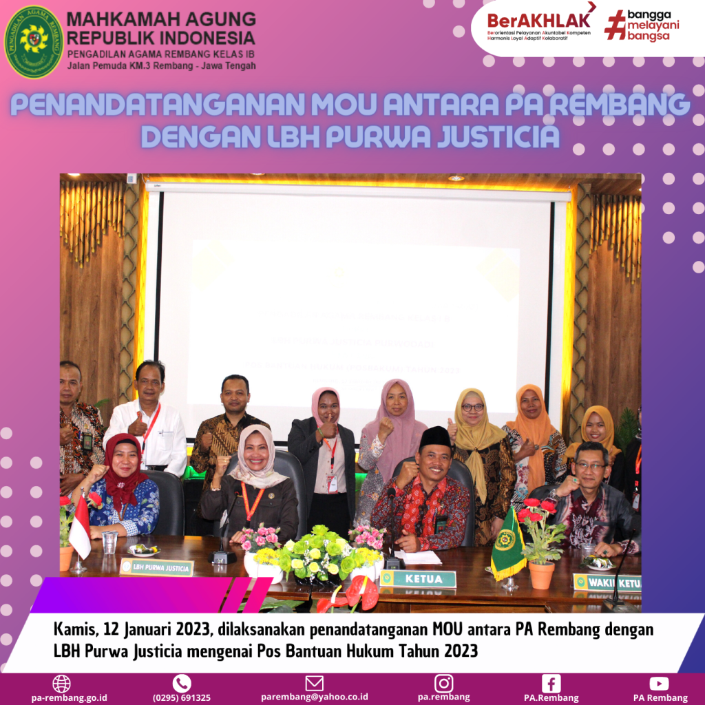 Rembang (12/01) | Pengadilan Agama Rembang melaksanakan penandatanganan perjanjian kerja sama (MoU) dengan LBH Purwa Justicia mengenai Pos Bantuan Hukum (Posbakum) Tahun 2023. MoU ditandatangani langsung oleh Ketua Pengadilan Agama Rembang, Bapak M.Safi’i, S.Ag dan Direktur LBH Purwa Justicia, Ibu Yunita Ratna Triastuti, S.H., M.H. bertempat di Aula Pengadilan Agama Rembang.