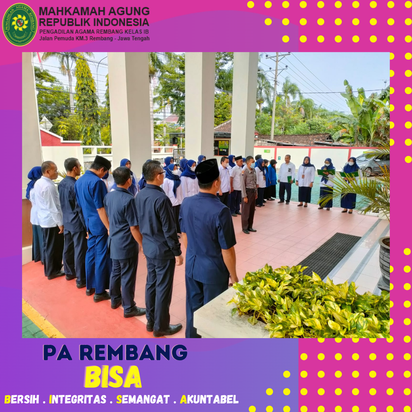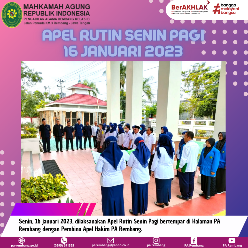 Rembang (16/01) Pengadilan Agama Rembang laksanakan apel rutin Senin pagi yang bertempat di halaman kantor. Berkesempatan pada apel pagi hari ini dengan Pembina yaitu Hakim PA Rembang, Bapak H. Moch Yudha Teguh Nugroho, S.H.I., M.H.