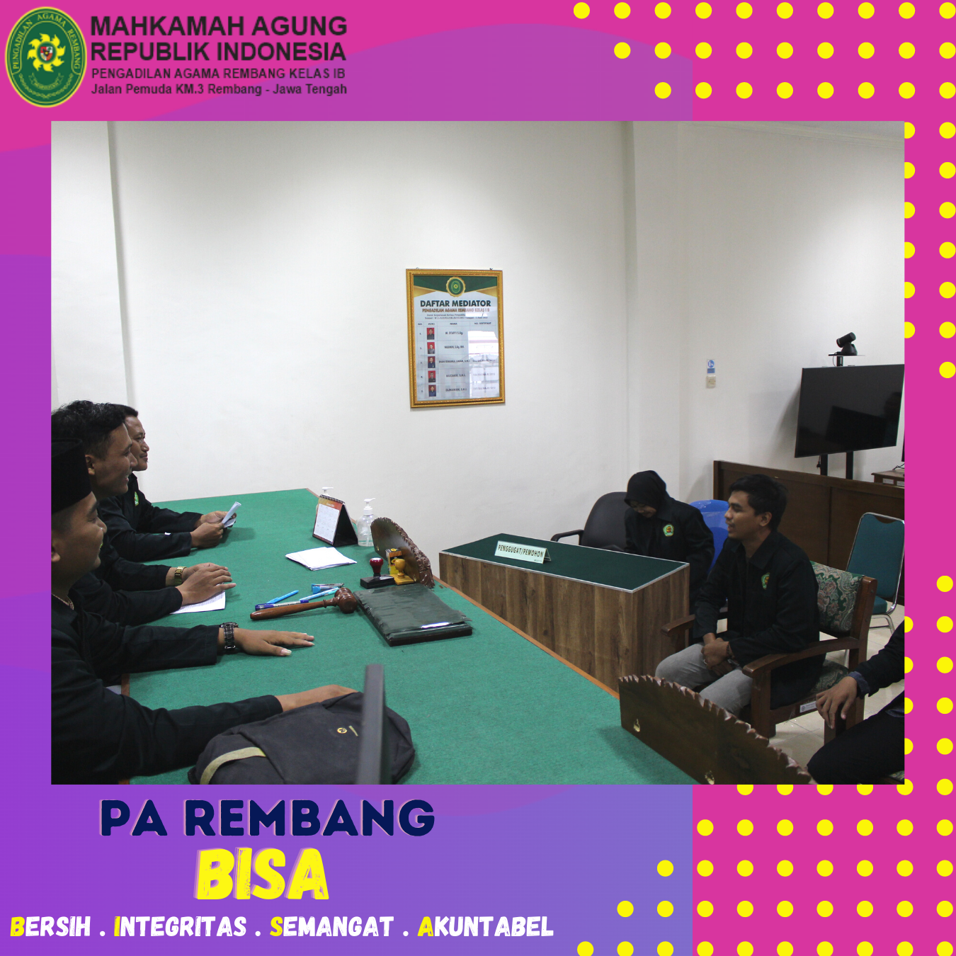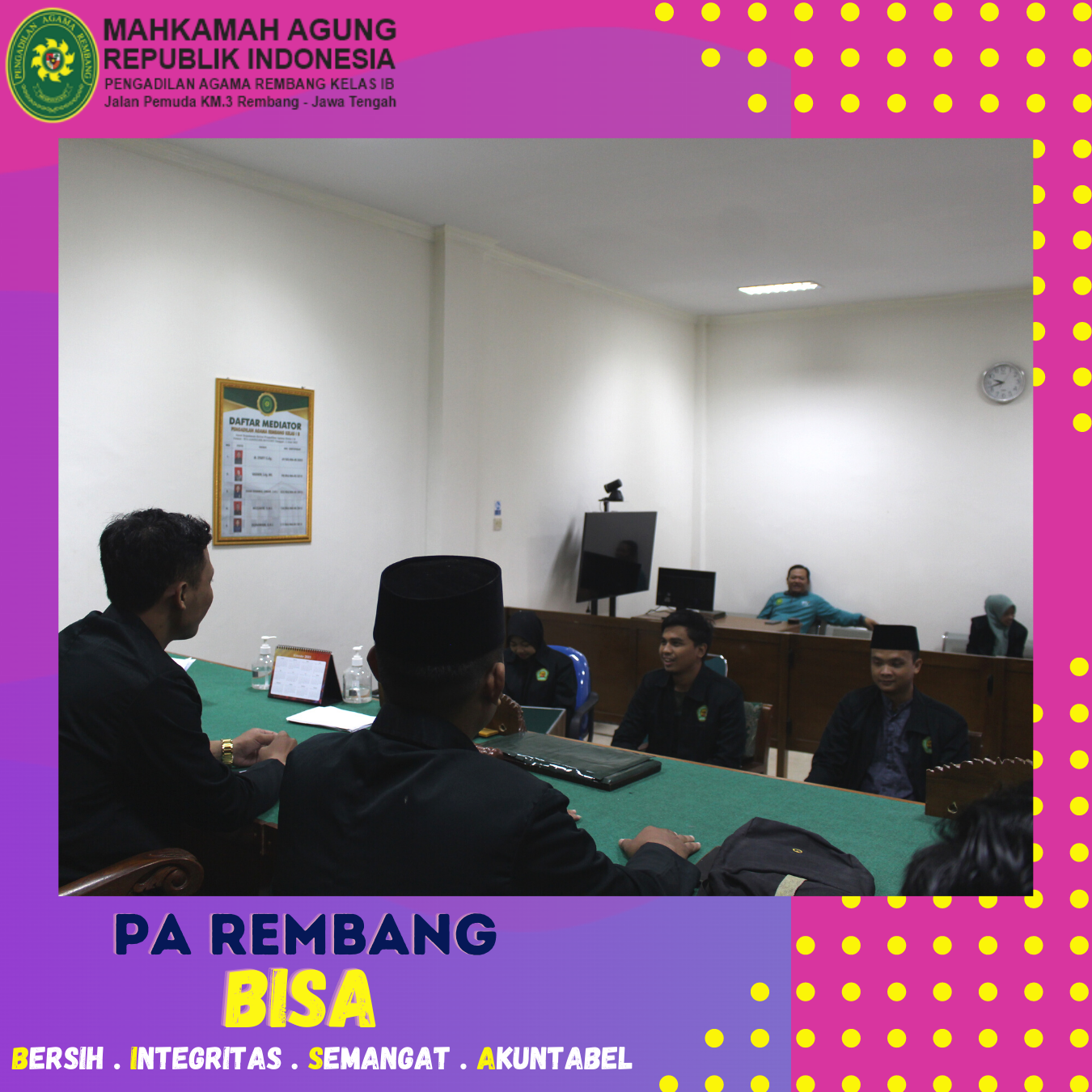 Jum’at (03/02) – Bertempat di Ruang Sidang PA Rembang, Mahasiswa yang sedang melaksanakan Praktik Latihan Kemahiran Hukum (PLKH) dari STAI Al Kamal Sarang mengadakan kegiatan Simulasi Sidang. Kegiatan simulasi sidang ini disaksikan langsung oleh Hakim PA Rembang Bapak H. Moch Yudha Teguh Nugroho, S.H.I., M.H. selaku Hakim Pembimbing dari mahasiswa PLKH STAI Al Kamal Sarang.