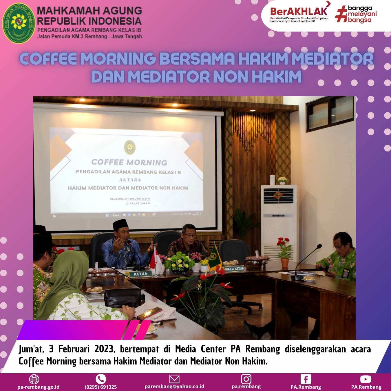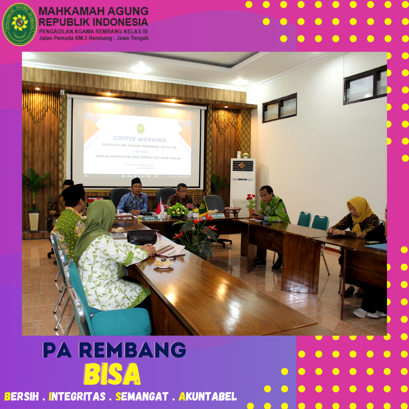 Jum’at (03/02) – Bertempat di Media Center PA Rembang, dilaksanakan Acara Coffe Morning Bersama Hakim Mediator dan Mediator Non Hakim PA Rembang. Dalam acara ini dihadiri oleh Ketua, Wakil Ketua, Hakim, Panitera, Panmud Hukum dan Panmud Gugatan PA Rembang, serta Bapak Ahmad Najieh, S.H.C.Med dan Ibu Nur Chasanah, AMKG.,S.H.,C.Med selaku Mediator Non Hakim PA Rembang. Dalam acara Coffe Morning ini disampaikan beberapa hal terkait upaya peningkatan keberhasilan mediasi untuk tahun 2023 serta optimalisasi peran mediator non hakim di PA Rembang.