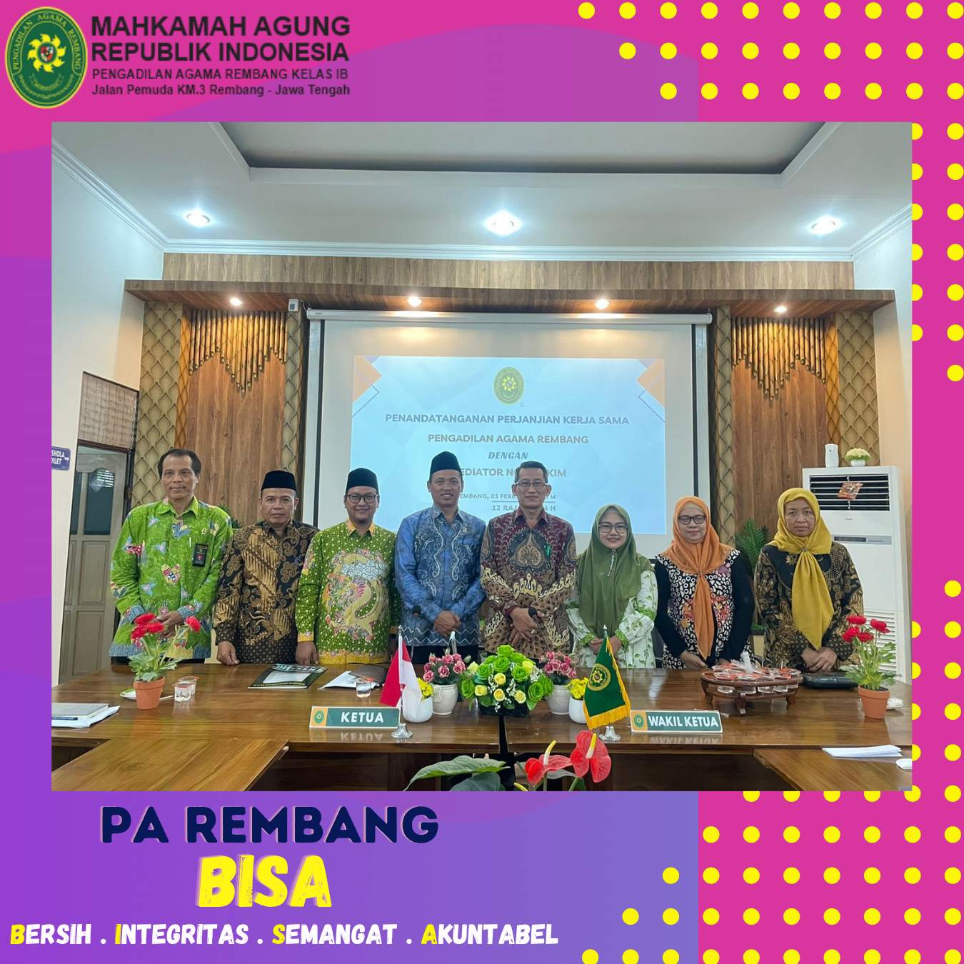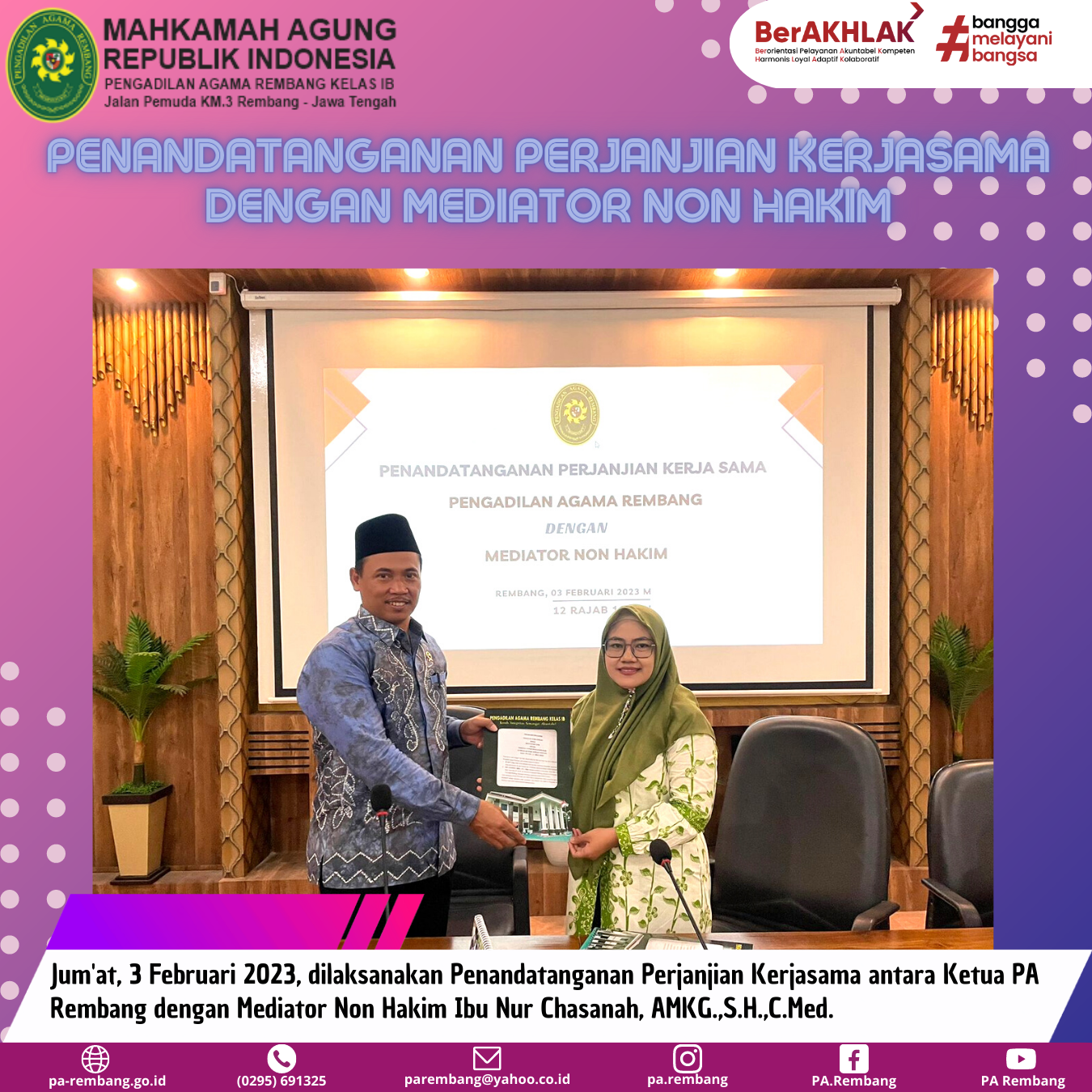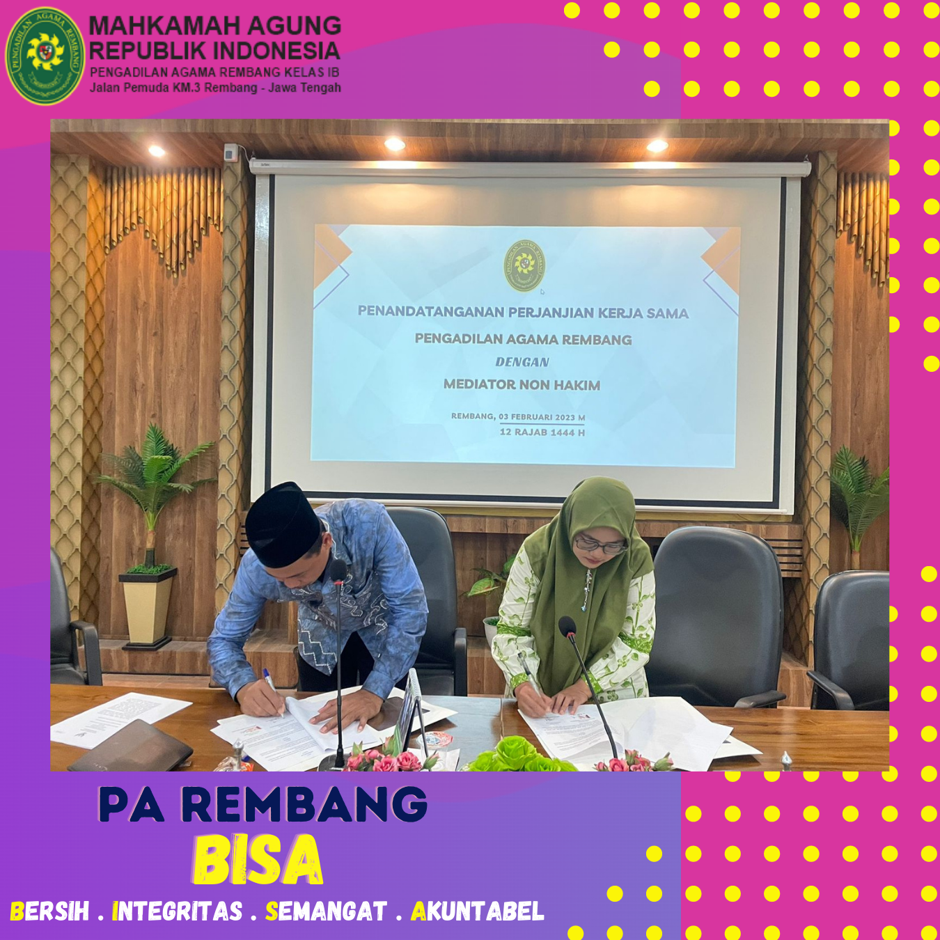 Jum’at (03/02) – Bertempat di Media Center PA Rembang, dilaksanakan Penandatanganan Perjanjian Kerjasama antara PA Rembang dengan Mediator Non Hakim. Dalam acara penandatanganan ini dihadiri oleh Ketua, Wakil Ketua, Hakim, Panitera, Panmud Hukum dan Panmud Gugatan PA Rembang serta hadir selaku Mediator Non Hakim yakni Bapak Ahmad Najieh, S.H.C.Med dan Ibu Nur Chasanah, AMKG.,S.H.,C.Med. Acara penandatanganan ini dilaksanakan oleh Ketua PA Rembang Bapak M. Safi’i, S.Ag dengan Ibu Nur Chasanah, AMKG.,S.H.,C.Med. selaku Meditor Non Hakim.
