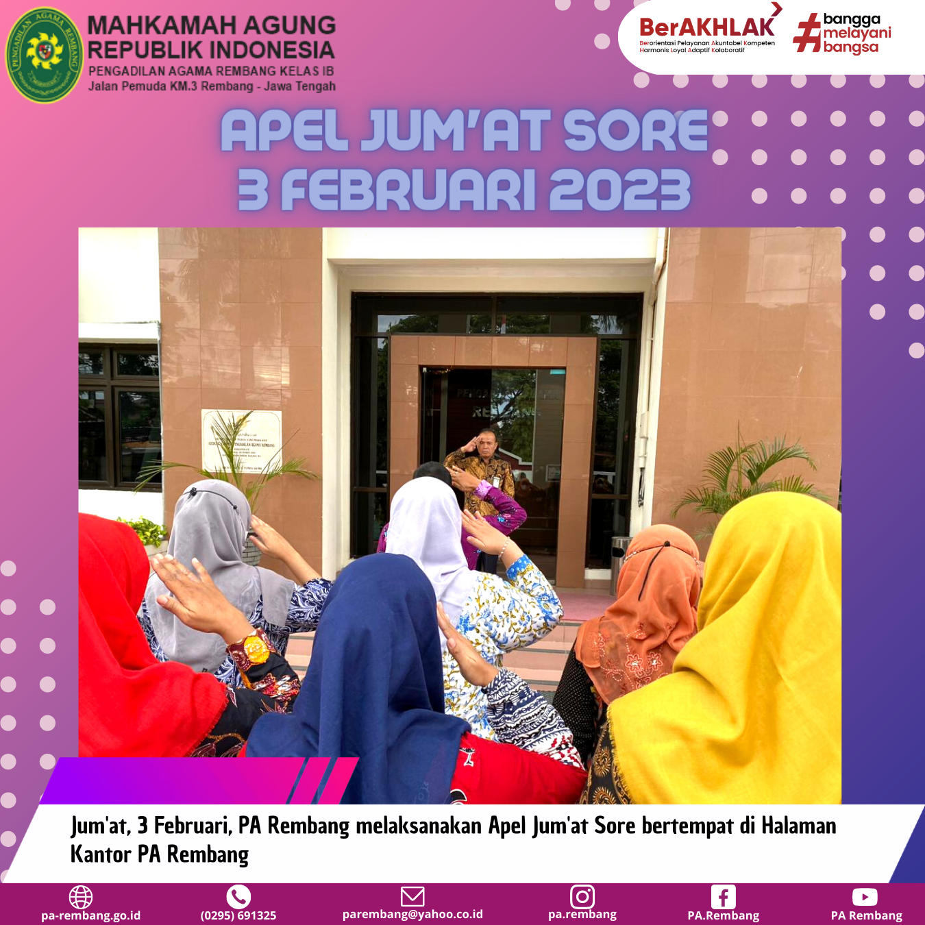 Jum’at, 3 Februari 2023, Pengadilan Agama Rembang laksanakan apel rutin Jumat sore yang bertempat di halaman kantor PA Rembang. Berkesempatan pada apel sore hari ini dengan Pembina yaitu Panitera PA Rembang, Bapak Kastari, S.H.