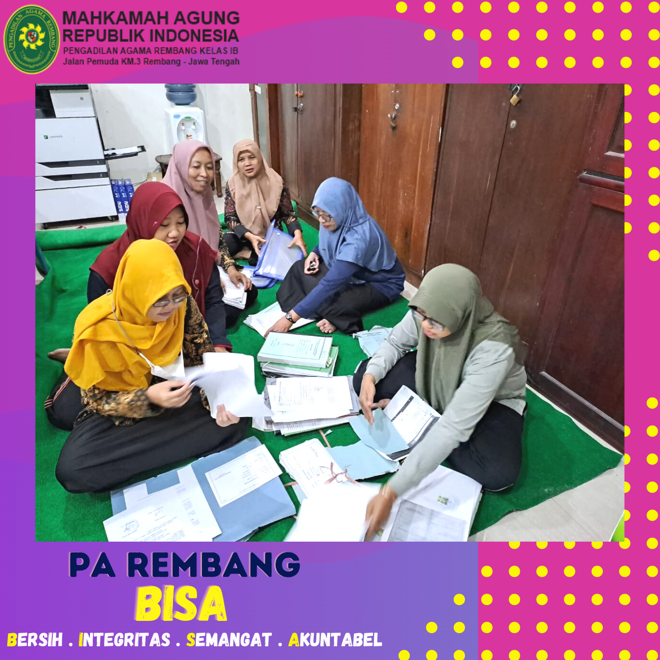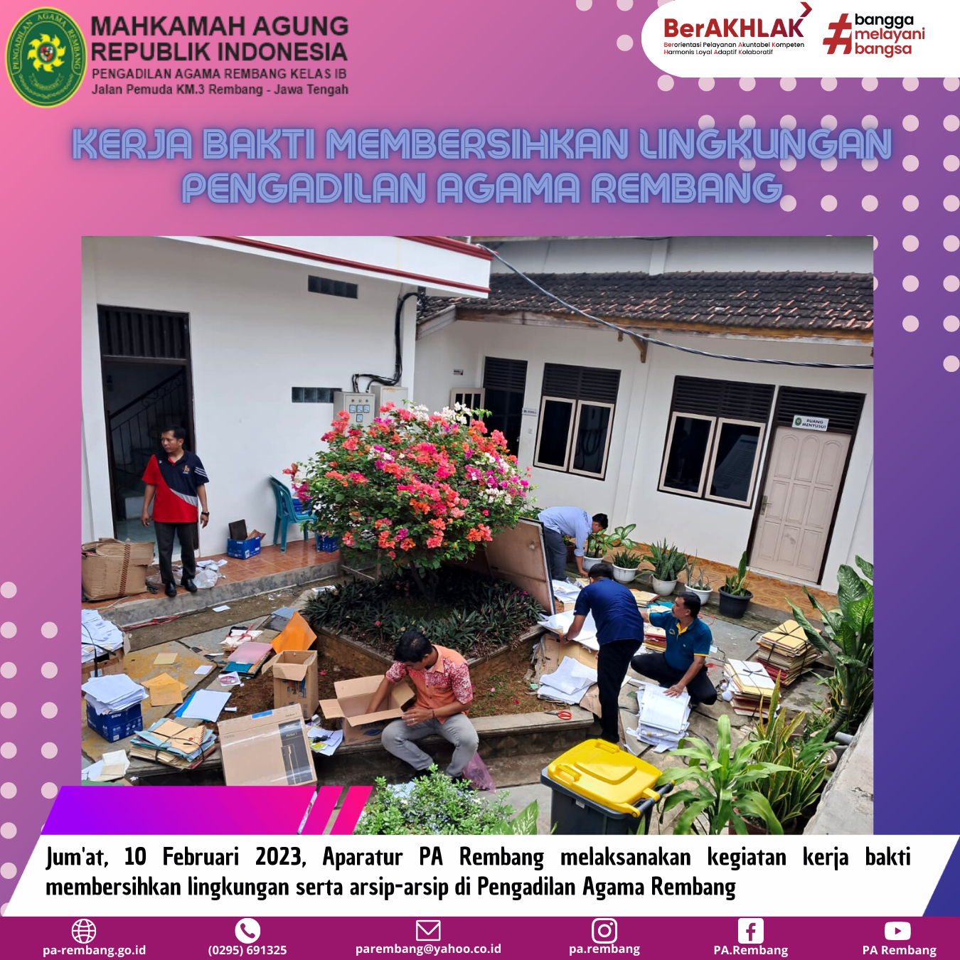 Jum’at (10/02) – Aparatur PA Rembang melaksanakan kegiatan Jum’at Bersih dengan melakukan kerja bakti membersihkan lingkungan PA Rembang. Seluruh aparatur PA Rembang saling bergotong-royong untuk membersihkan arsip-arsip lama yang ada di PA Rembang sehingga tercipta lingkungan yang lebih bersih dan lebih rapi. Dengan lingkungan yang bersih dan rapi , mampu meningkatkan kenyamanan aparatur PA Rembang dalam bekerja.