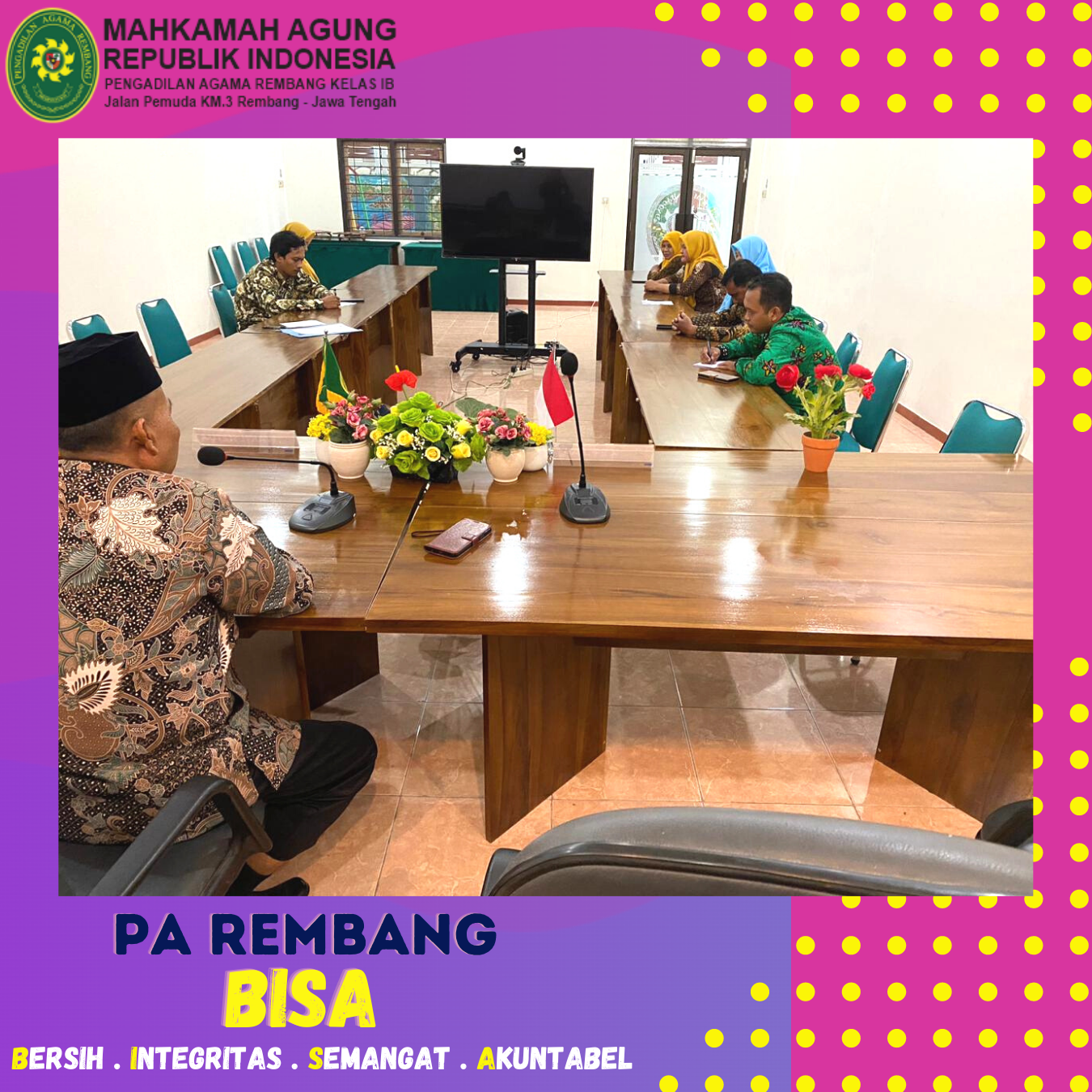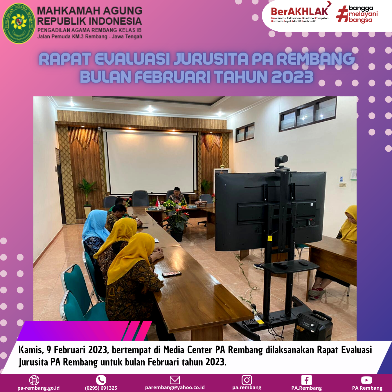 Kamis (09/02) – Bertempat di Media Center PA Rembang dilaksanakan Rapat Evaluasi rutin untuk Jurusita PA Rembang. Rapat ini dipimpin oleh Panitera PA Rembang, Bapak Kastari, S.H serta dihadiri oleh seluruh jurusita di PA Rembang. Kegiatan ini dilaksanakan dalam rangka memberikan pengarahan serta evaluasi rutin terhadap kinerja Jurusita PA Rembang.