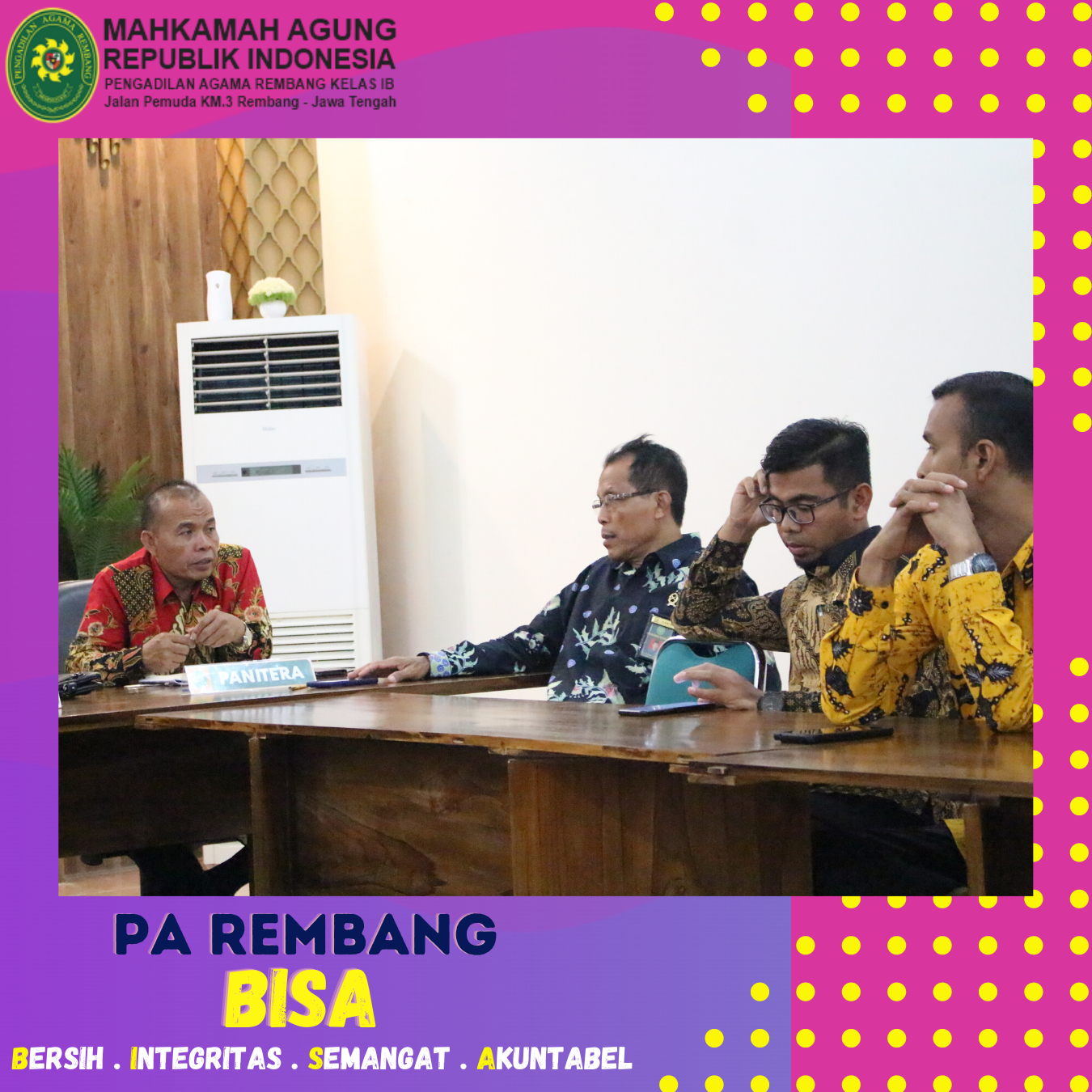 Kamis (16/02/2023) – Aparatur PA Rembang melaksanakan kegiatan Rapat Evaluasi Kinerja Bulan Februari tahun 2023 bertempat di Ruang Media Center PA Rembang. Rapat ini dilaksanakan pukul 13.30 WIB dipimpin oleh Ketua PA Rembang Bapak M.Safi’i, S.Ag dan Wakil Ketua PA Rembang Bapak Nadimin, S.Ag.,M.H. Rapat dihadiri oleh seluruh Hakim, Panitera, Sekretaris, Pejabat Struktural dan Fungsional, Pelaksana serta PPNPN PA Rembang.