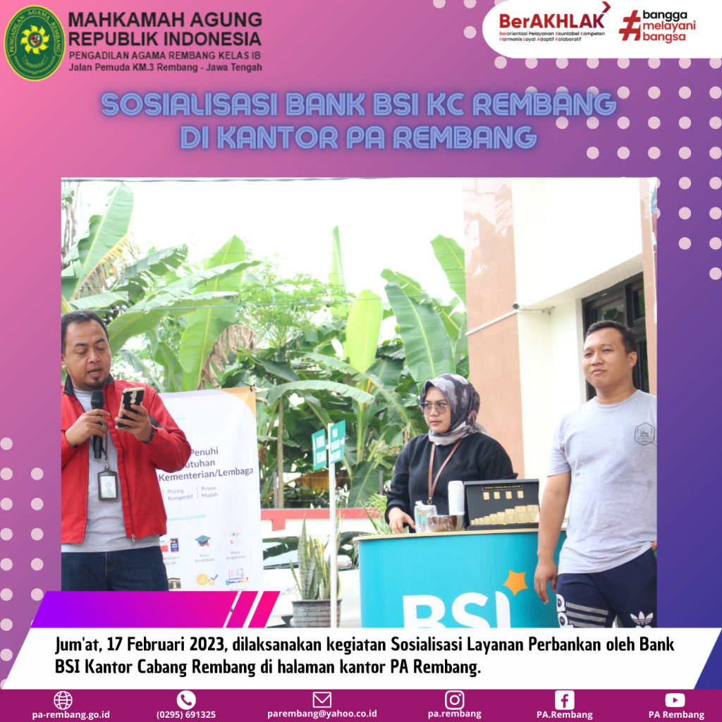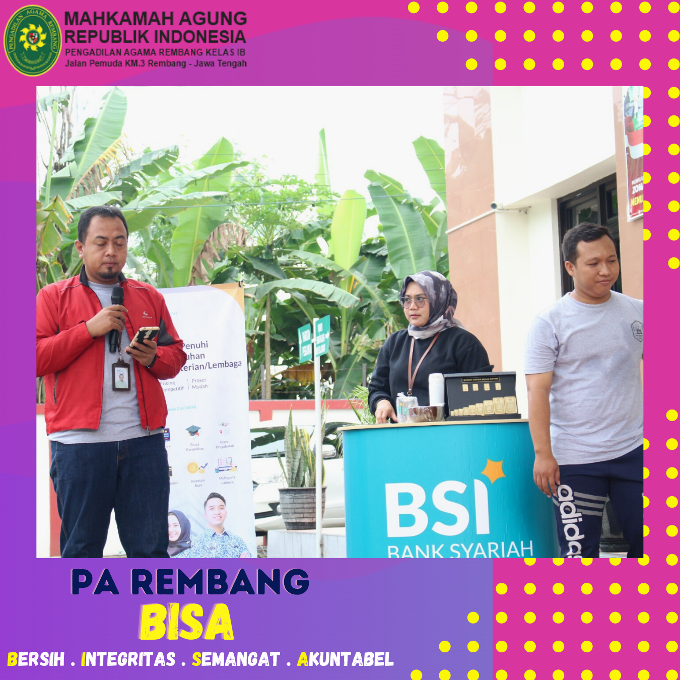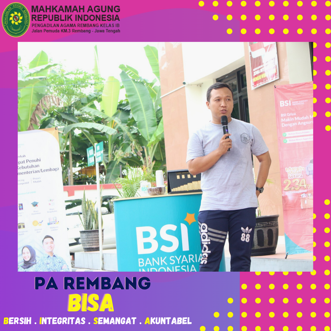 Dalam sosialisasi ini disampaikan terkait macam-macam layanan perbankan yang ditawarkan oleh Bank BSI. Layanan tersebut antara lain berupa tabungan syariah, tabungan haji dan umroh, pembiayaan syariah, serta investasi syariah. Aparatur PA Rembang sangat antusias dalam mengikuti kegiatan sosialisasi ini. Kegiatan ini sangat bermanfaat untuk menambah wawasan bagi Aparatur PA Rembang terkait layanan perbankan yang ditawarkan oleh Bank BSI.
