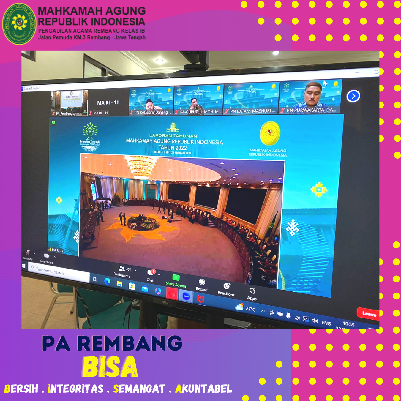 Rembang (22/02) – dilaksanakan Gladi bersih Laporan Tahunan Mahkamah Agung RI tahun 2022, yang diikuti oleh Wakil Ketua Pengadilan Agama Rembang melalui zoom meeting bertempat di Media Centre Pengadilan Agama Rembang.