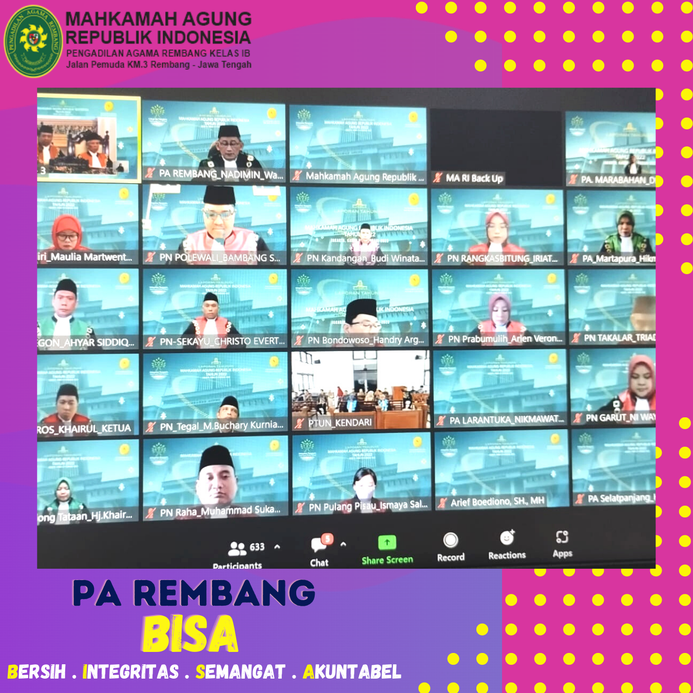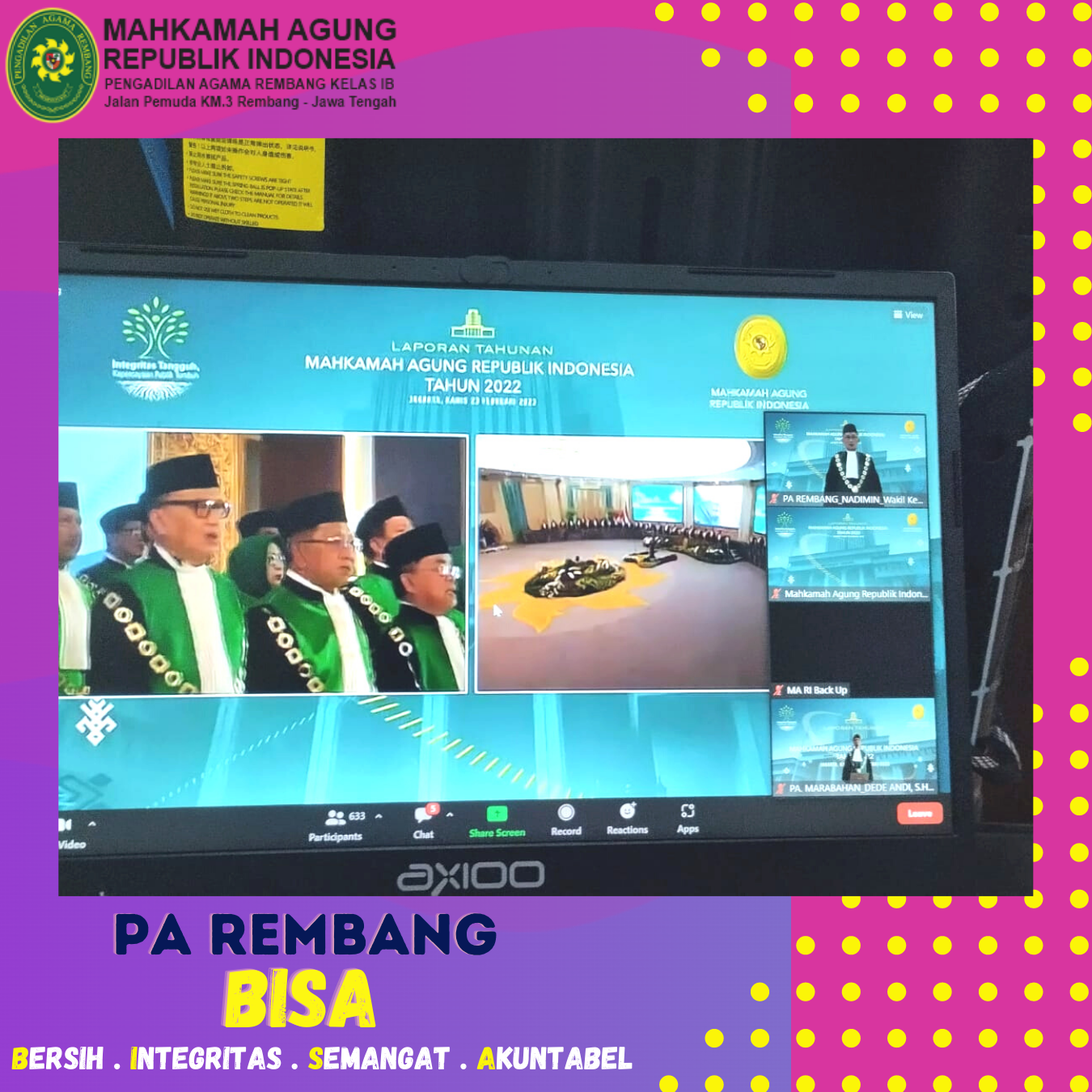 Rembang (23/02) – Bertempat di ruang media center, Wakil Ketua Pengadilan Agama Rembang, YM. Nadimin, S.Ag.,M.H. mengikuti Kegiatan Laporan Tahunan Mahkamah Agung RI 2022 yang dilaksanakan secara daring.