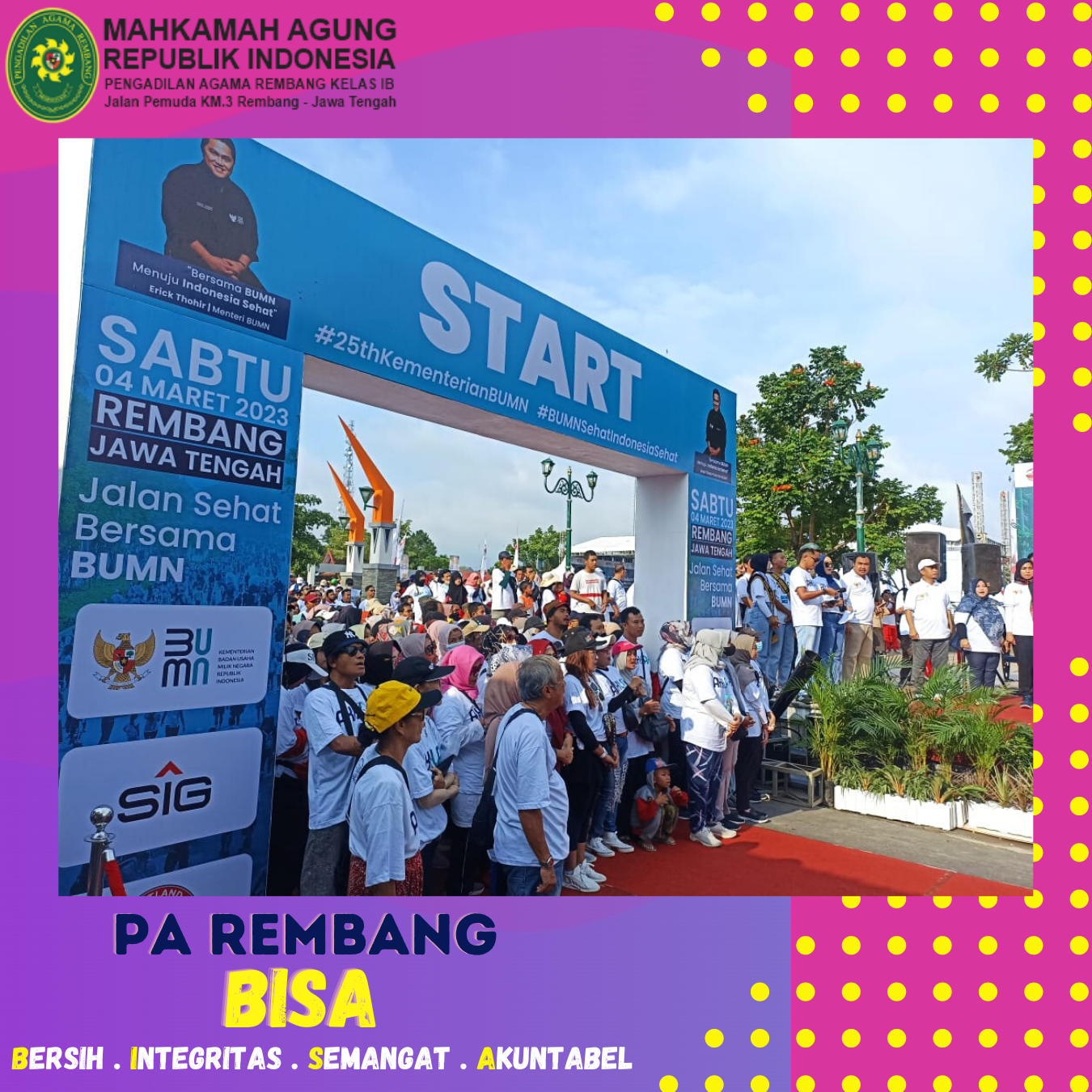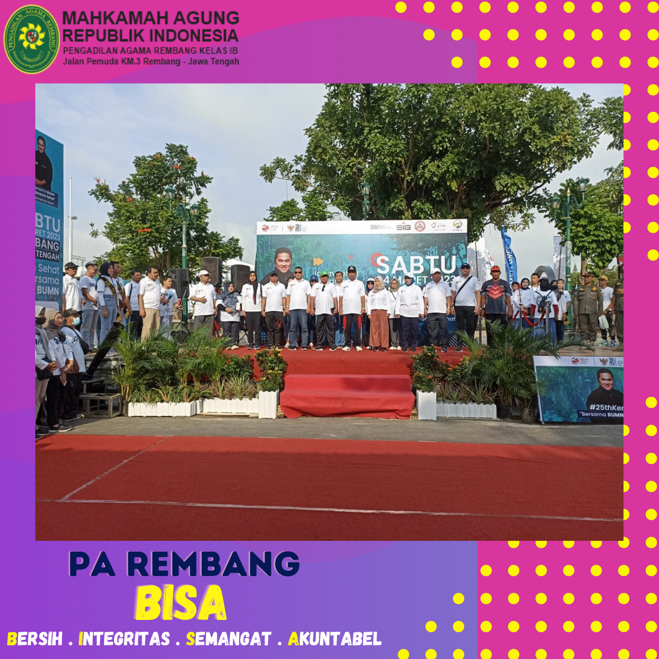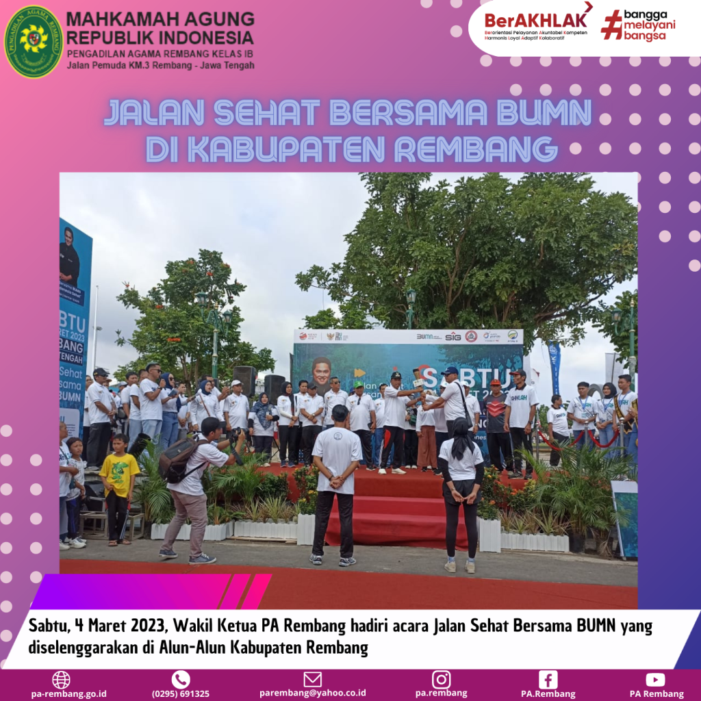 Sabtu (04/03) – Memperingati Hari Ulang Tahun (HUT) ke-25 Kementerian Badan Usaha Milik Negara (BUMN), PT. Semen Gresik menggelar acara jalan sehat bersama BUMN. Wakil Ketua Pengadilan Agama Rembang, YM. Nadimin, S.Ag.,M.H menghadiri acara tersebut beserta seluruh jajaran Forkopimda Kabupaten Rembang.