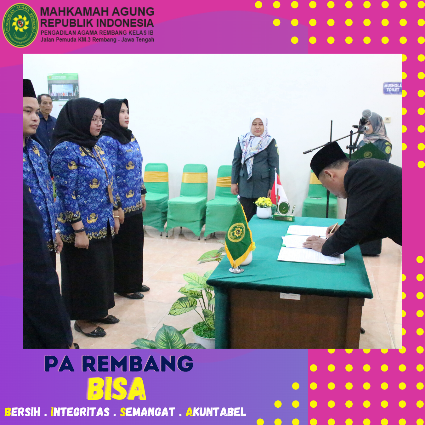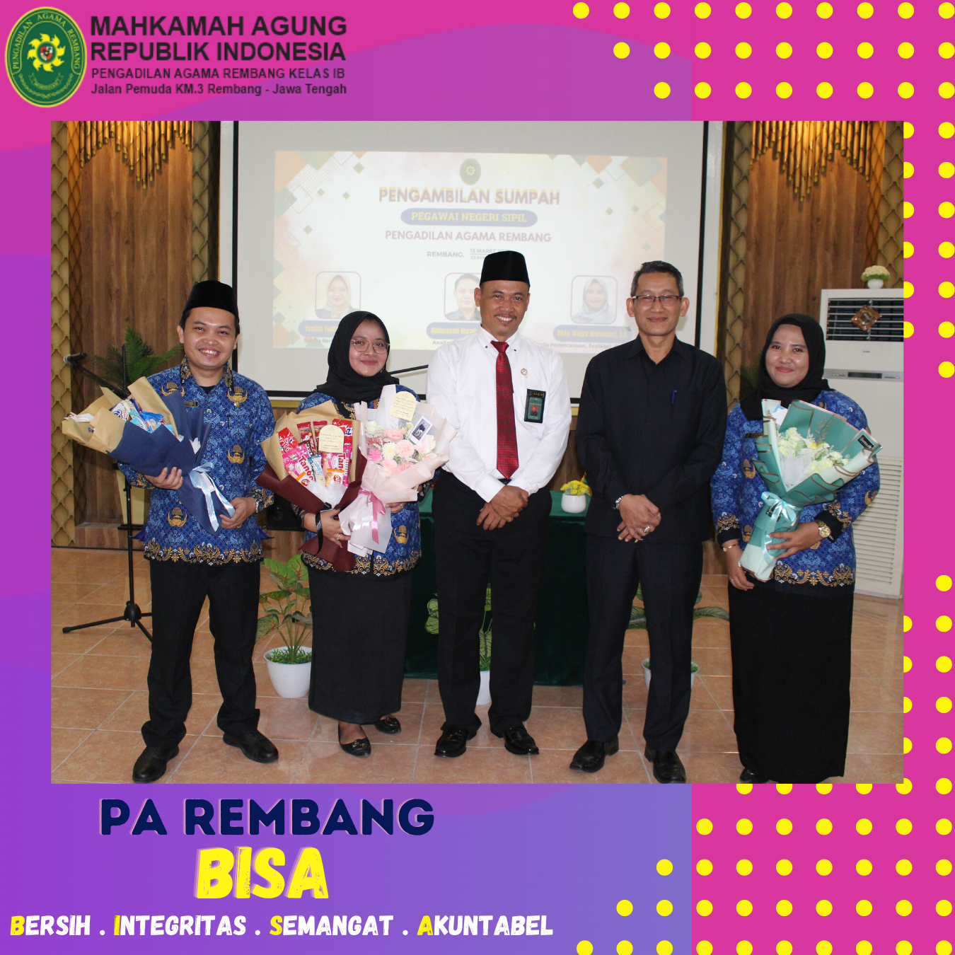 Rabu (15/03) – Bertempat di Ruang Media Center PA Rembang, dilaksanakan Pengambilan Sumpah PNS untuk CPNS Golongan III pada PA Rembang. Acara dimulai pukul 14.00 WIB dan dihadiri oleh seluruh aparatur PA Rembang. Ketua Pengadilan Agama Rembang, YM Safi’i, S.Ag. melantik tiga orang CPNS menjadi PNS PA Rembang. Ketiga CPNS tersebut adalah Okky Widya Arintasari, S.E. CPNS Analis Perencanaan, Evaluasi, dan Pelaporan; Yustisi Yudhasmara, S.H. dan Adiansyah Nurahman, S.H. CPNS Analis Perkara Peradilan. Acara berlangsung dengan lancar dan khidmat hingga selesainya acara. Di penghujung acara, ditutup dengan pemberian ucapan selamat kepada CPNS yang sudah dilantik dan foto bersama.