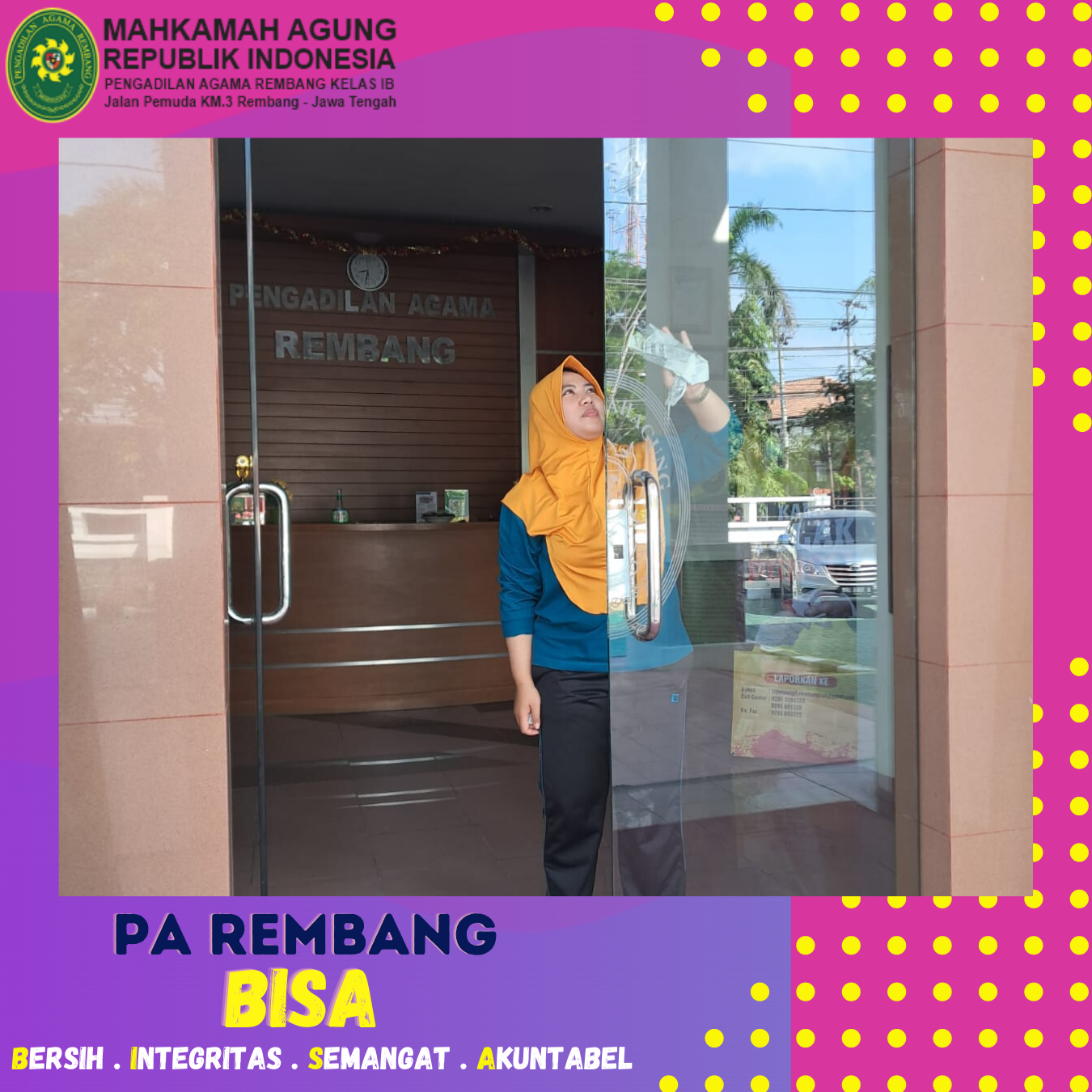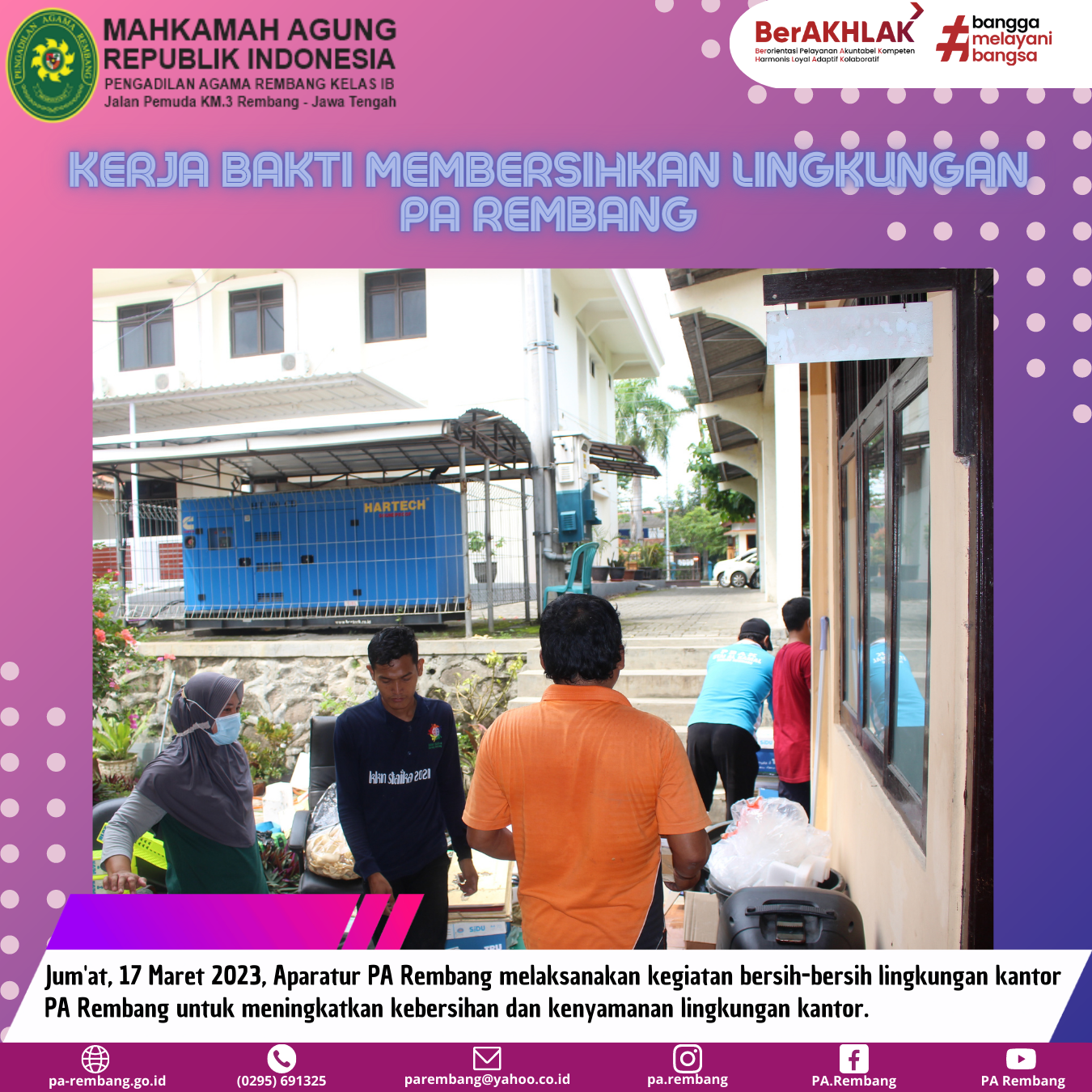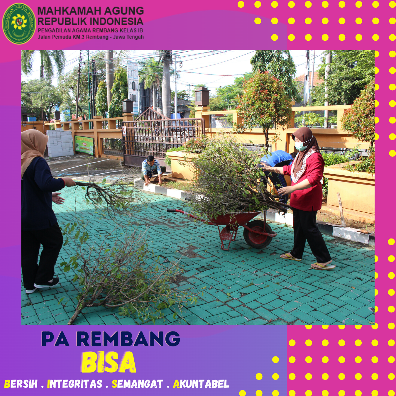 Jum’at (17/03) – Aparatur PA Rembang melaksanakan kegiatan Jum’at Bersih dengan melakukan kerja bakti membersihkan lingkungan PA Rembang. Seluruh aparatur PA Rembang saling bergotong-royong untuk membersihkan halaman dan ruangan-ruangan yang ada di PA Rembang sehingga tercipta lingkungan yang bersih dan rapi. Dengan lingkungan yang bersih dan rapi , mampu meningkatkan kenyamanan aparatur PA Rembang dalam bekerja.
