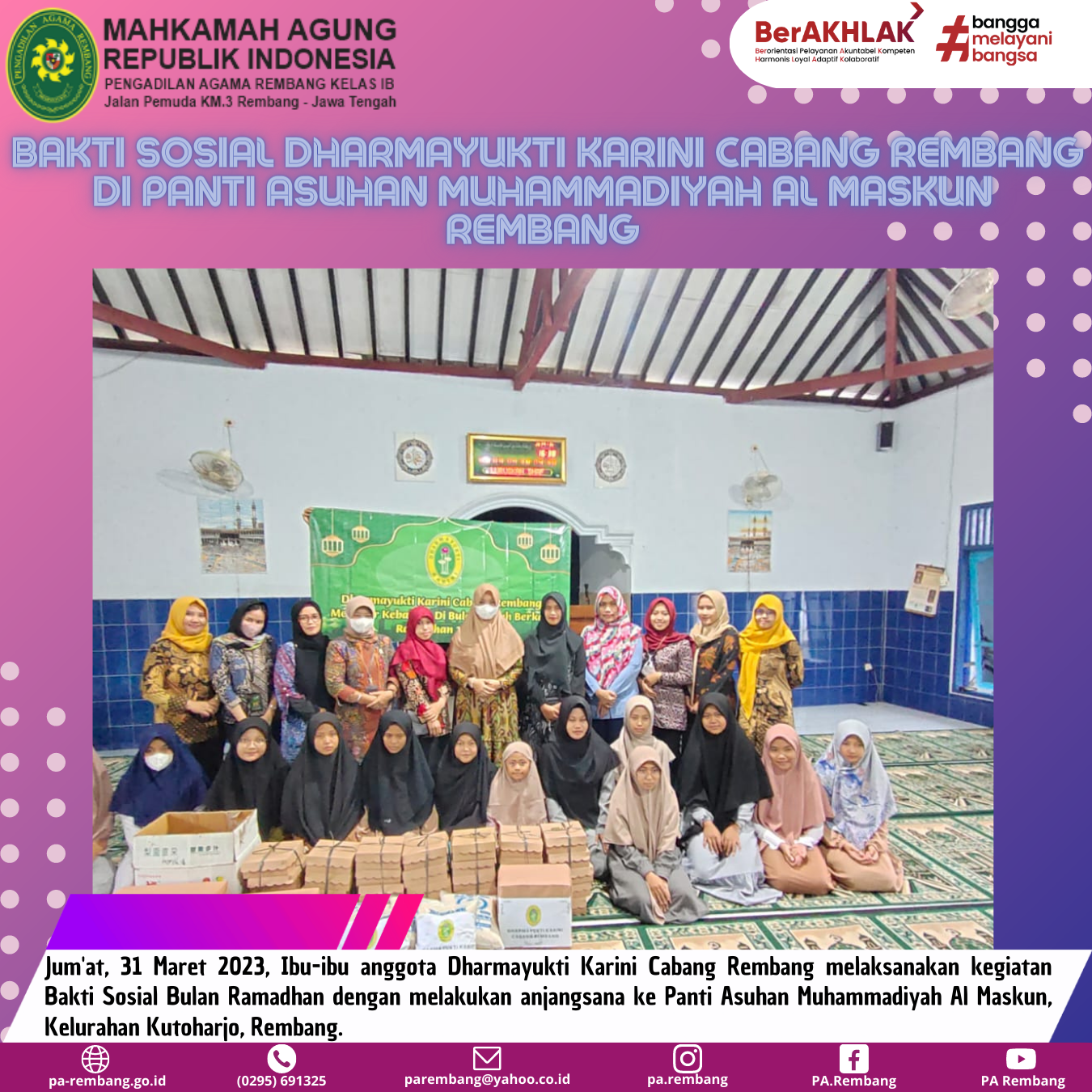Jum’at (31/03) – Ibu-ibu anggota Dharmayukti Karini Cabang Rembang melaksanakan kegiatan Bakti Sosial dengan melakukan anjangsana ke Panti Asuhan. Kegiatan anjangsana ini mengambil tema Menebar Kebaikan di Bulan Penuh Berkah Ramadhan 1444 H. Pada kesempatan kali ini, dipilihlah Panti Asuhan Muhammadiyah Al Maskun yang terletak di Kelurahan Kutoharjo Rembang untuk disambangi oleh ibu-ibu DyK Cabang Rembang.
