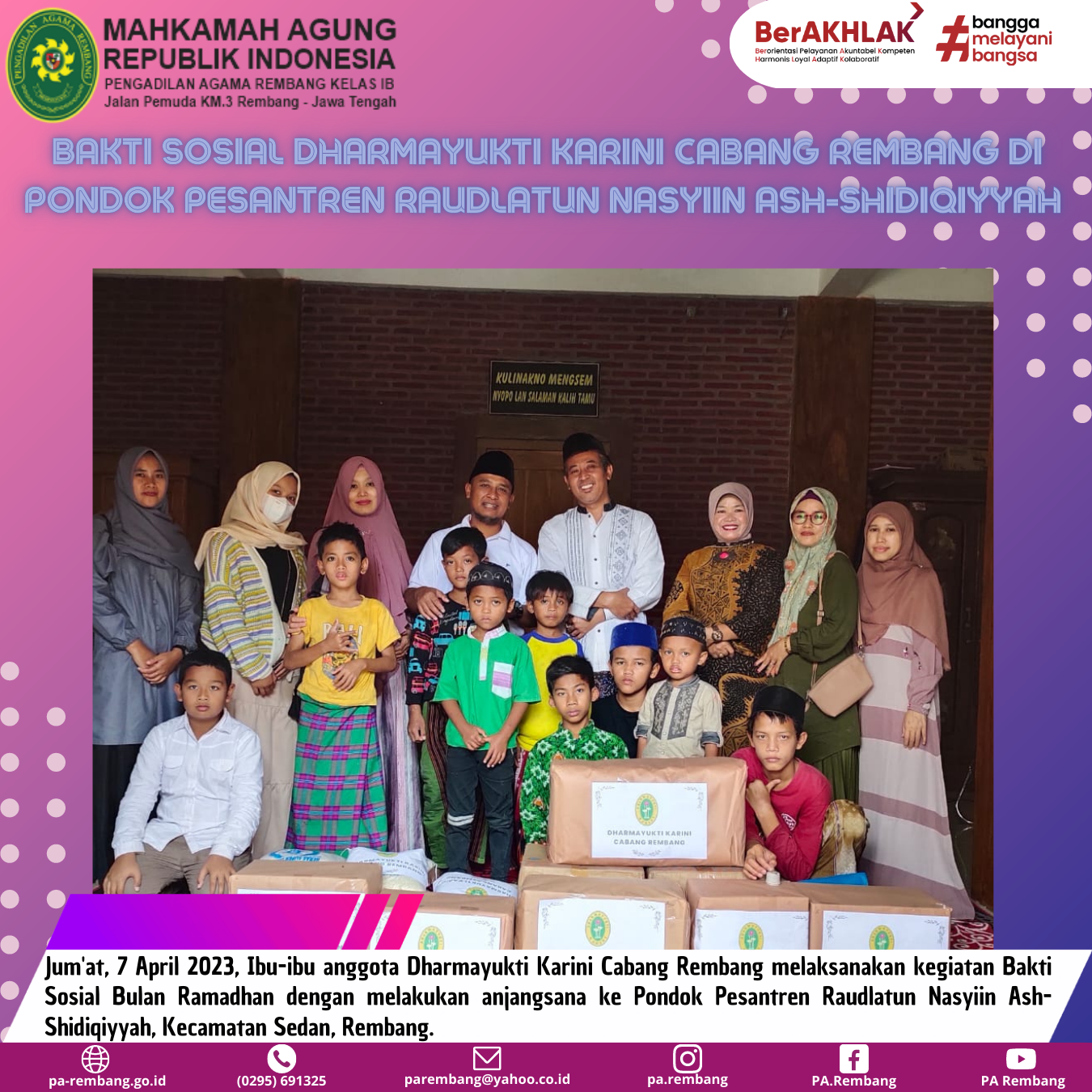 Semoga sedikit bantuan dari DyK Cabang Rembang bisa bermanfaat bagi seluruh penghuni ponpes di bulan yang penuh berkah ini. Aamiin