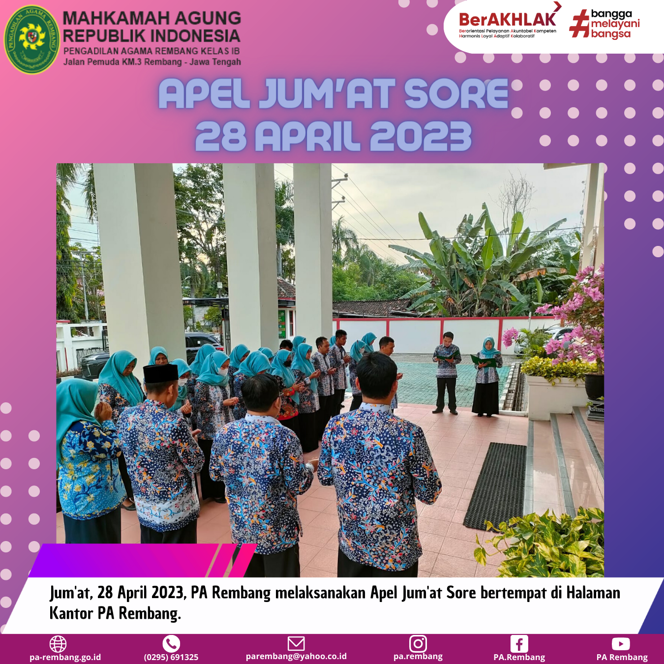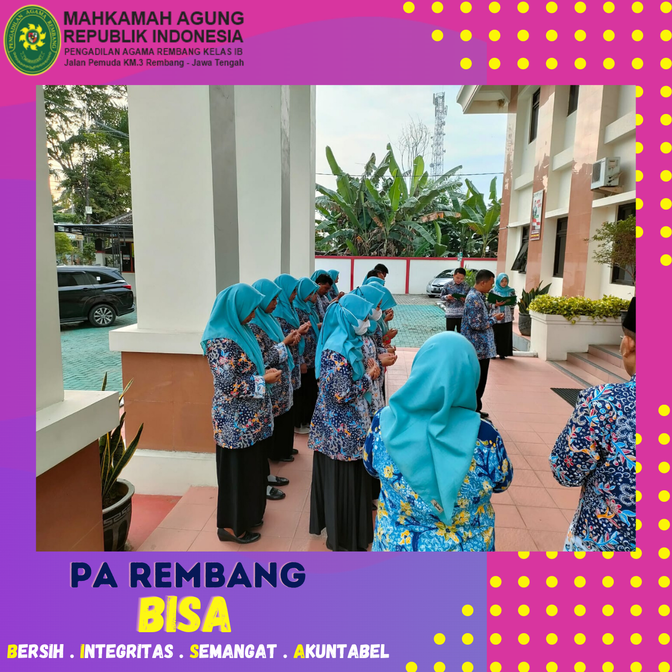 Jum’at (28/04) – Pengadilan Agama Rembang laksanakan apel rutin Jum’at Sore yang bertempat di halaman kantor PA Rembang. Berkesempatan sebagai pembina apel sore ini yaitu Hakim PA Rembang, Bapak Muzakir, S.H.I. Kegiatan apel Jum’at sore ini merupakan apel pertama pasca diliburkannya kegiatan apel selama bulan Ramadhan lalu. Seluruh aparatur Pengadilan Agama Rembang tampak tertib dan khidmat mengikuti pelaksanaan apel Jum’at sore ini.