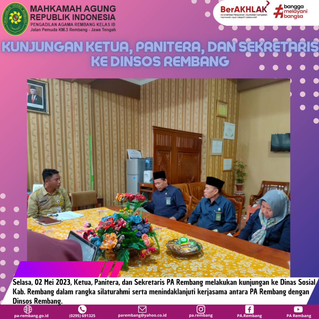 Selasa (02/05) – Ketua, Panitera, dan Sekretaris PA Rembang melakukan kunjungan ke Dinas Sosial Rembang. Kunjungan kali ini dalam rangka silaturahmi karena masih dalam moment lebaran 1444 H, serta dalam rangka menindaklanjuti kerjasama antara PA Rembang dengan Dinsos Rembang terkait dengan Dispensasi Nikah yang selama ini sudah berjalan dengan baik.