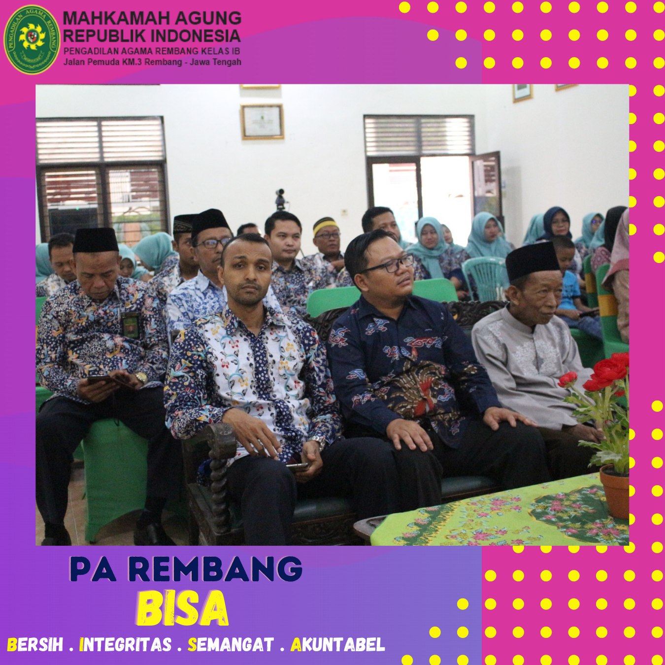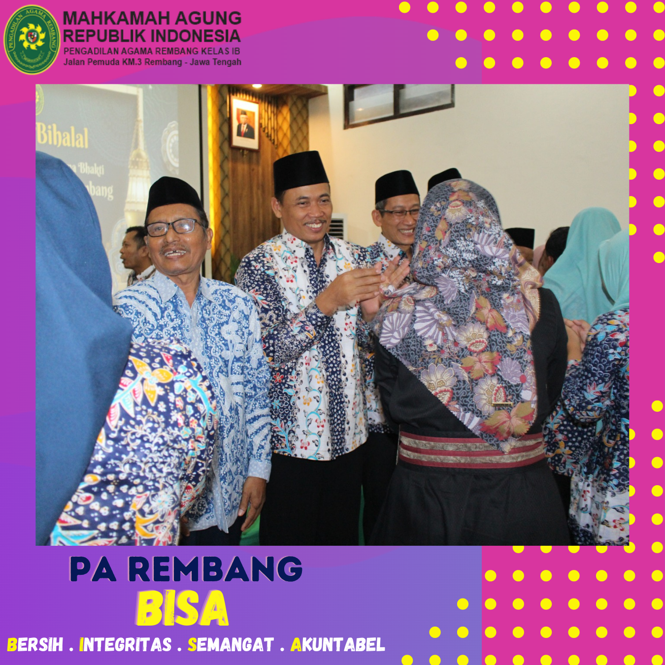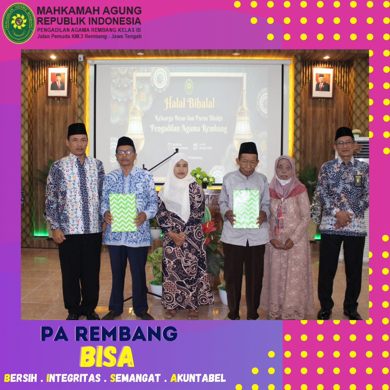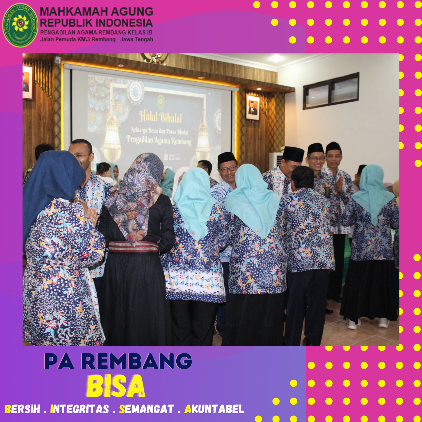 Kamis (27/04) – Pengadilan Agama Rembang mengadakan Acara Halal Bihalal pada hari kedua kerja setelah libur lebaran Idul Fitri 1444 H. Kegiatan Halal Bihalal ini dilaksanakan rutin setiap tahun di Bulan Syawal. Acara Halal Bihalal ini diikuti oleh seluruh aparatur PA Rembang beserta keluarga dari aparatur PA Rembang. Acara Halal Bihalal dipimpin dan dibuka dengan sambutan dari Ketua Pengadilan Agama Rembang yaitu Bapak M.Safi’i, S.Ag, kemudian dilanjutkan dengan acara ramah tamah, makan bersama dan ditutup dengan bersalam-salaman dengan seluruh pegawai dan keluarganya. Acara Halal Bihalal ini diselenggarakan bertujuan untuk mempererat tali persaudaraan antar Pegawai serta meningkatkan solidaritas sesama Pegawai di Pengadilan Agama Rembang.