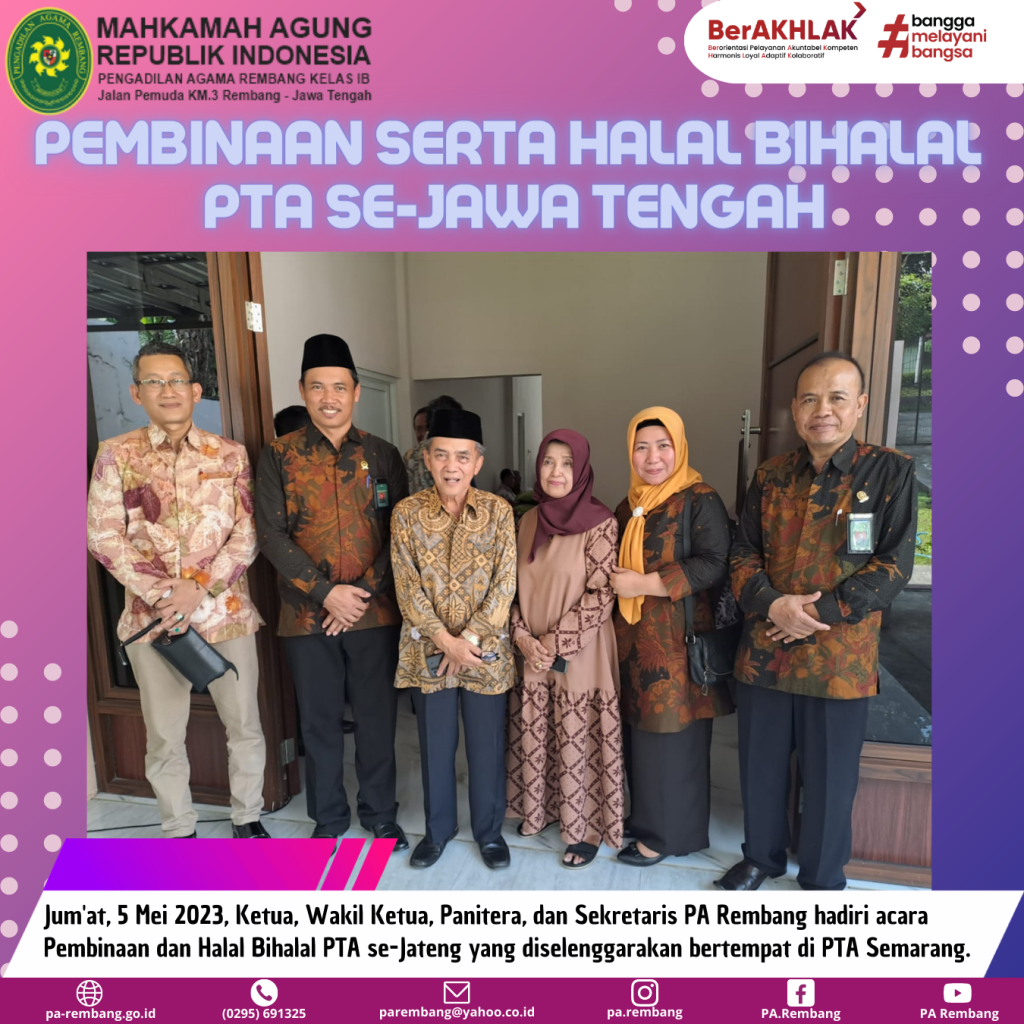 Jumat (05/05) – Pengadilan Tinggi Agama Semarang mengadakan kegiatan pembinaan untuk Pengadilan Agama Se-Jawa Tengah serta Halal Bihalal. Pengadilan Agama Rembang pun turut hadir dalam kegiatan ini.