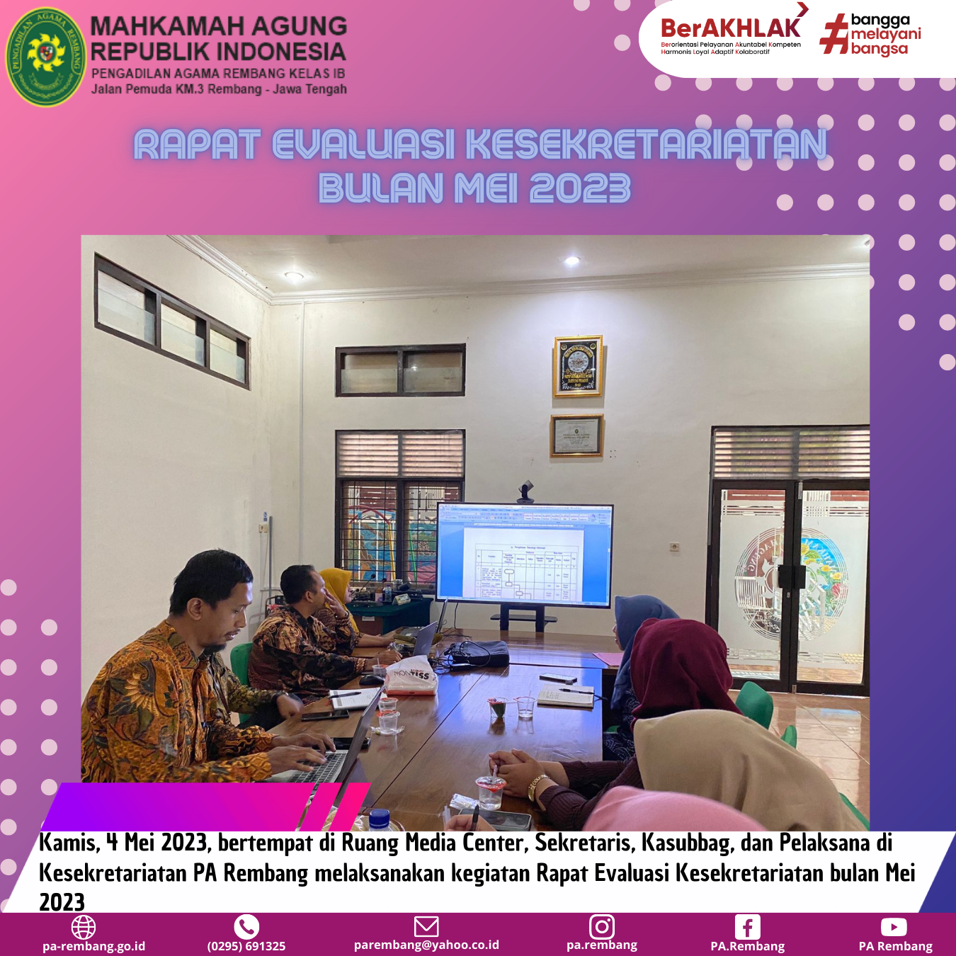 Kamis (04/05) – bertempat di Ruang Media Center PA Rembang, dilaksanakan Rapat Evaluasi untuk bagian Kesekretariatan yang diikuti oleh Sekretaris, Kasubbag Kepegawaian dan Ortala, Kasubbag PTIP, Kasubbag Umum dan Keuangan, beserta para staf bagian kesekretariatan PA Rembang.