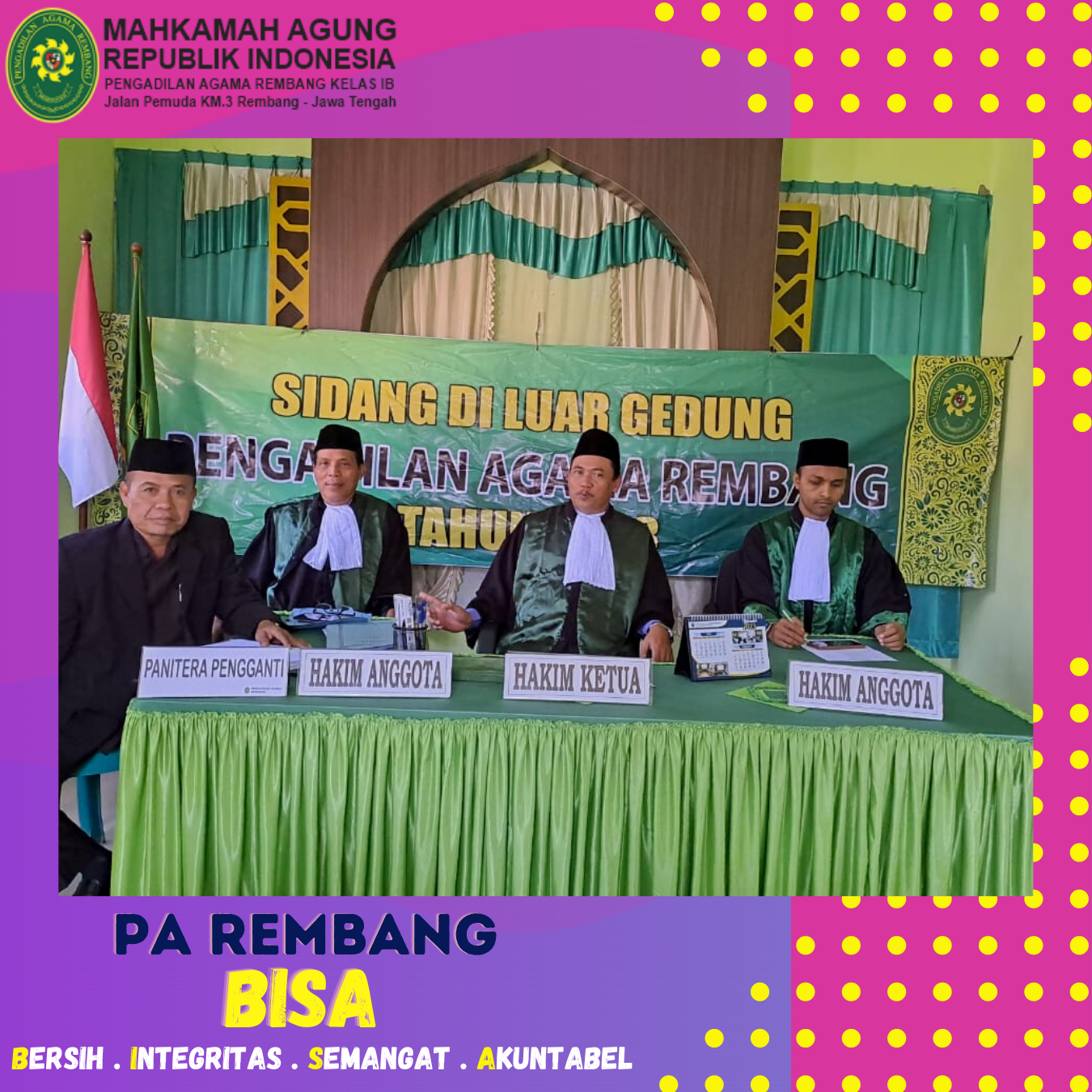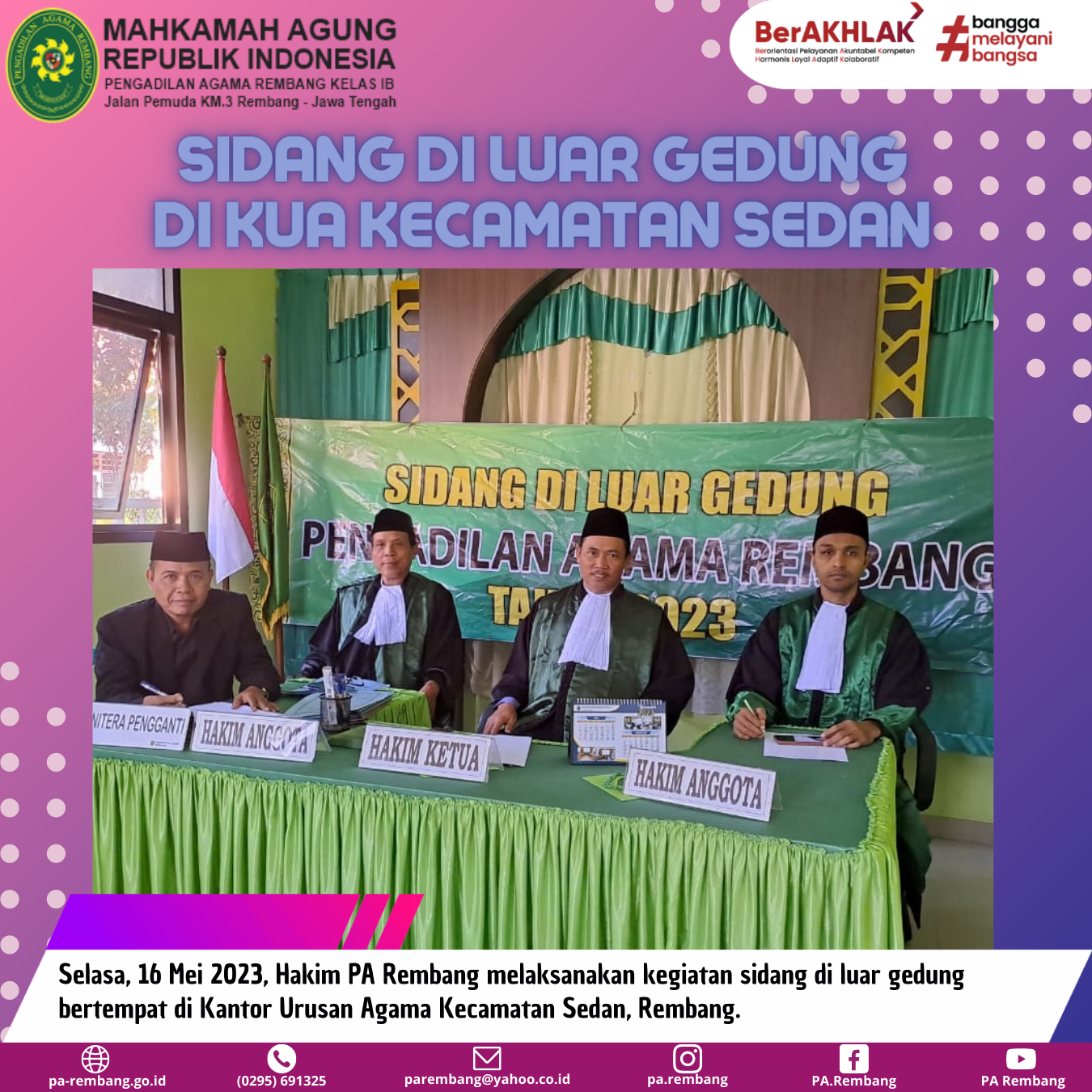 Selasa (16/05/2023) – Pengadilan Agama Rembang kembali melaksanakan kegiatan sidang keliling di Kabupaten Rembang. Pada kesempatan kali ini, sidang di luar gedung dipimpin oleh Ketua Pengadilan Agama Rembang, Bapak M. Safi’i, S.Ag., dengan Hakim Anggota yaitu Hakim PA Rembang, Bapak Drs. H. Zaenal Arifin, M.H. dan Bapak Muzakir, S.H.I., serta yang bertindak sebagai Panitera Pengganti yaitu Panitera PA Rembang Bapak Kastari, S.H.