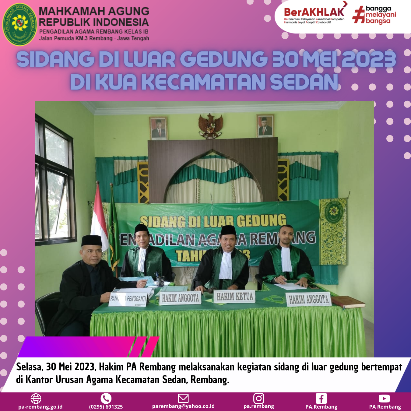 Selasa (30/05/2023) – Pengadilan Agama Rembang kembali melaksanakan kegiatan sidang keliling di Kabupaten Rembang. Pada kesempatan kali ini, sidang di luar gedung dipimpin oleh Ketua Pengadilan Agama Rembang, Bapak M. Safi’i, S.Ag., dengan Hakim Anggota yaitu Bapak Drs. H. Zaenal Arifin, M.H. dan Bapak Muzakir, S.H.I., serta yang bertindak sebagai Panitera Pengganti yaitu Panitera PA Rembang Bapak Kastari, S.H.