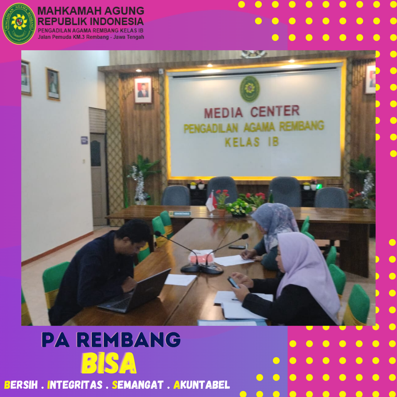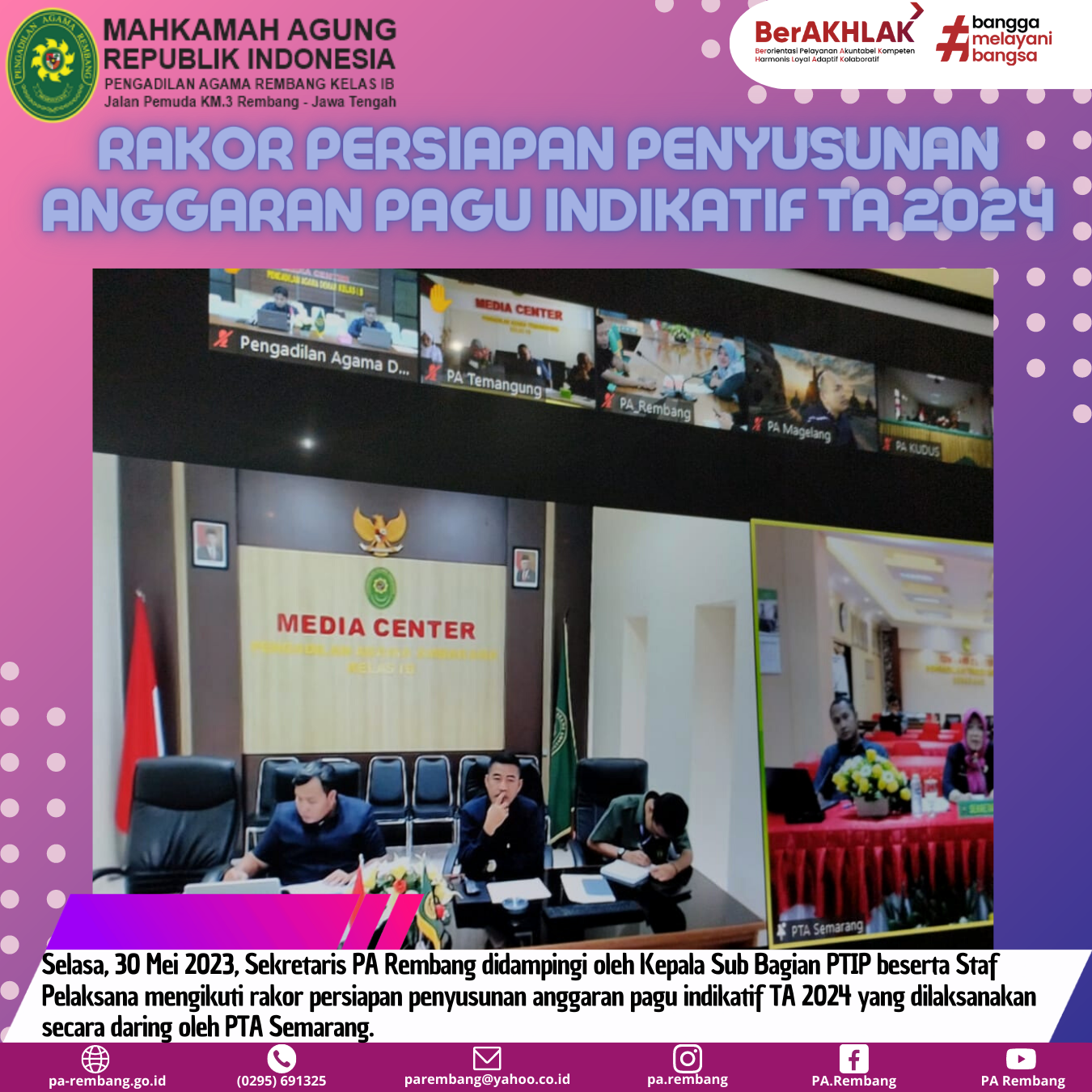 Selasa (30/05/2023) – Bertempat di Ruang Media Center, Sekretaris Pengadilan Agama Rembang, Ibu Siti Nor Safa’atun, S.Th.I., didampingi oleh Kepala Sub Bagian PTIP, Bapak Dyan Al Arif, S.E., beserta Staf Pelaksana Ibu Solikhah, S.E. mengikuti rapat koordinasi persiapan penyusunan anggaran pagu indikatif Tahun Anggaran 2024 yang dilaksanakan secara daring oleh PTA Semarang melalui aplikasi zoom meeting.