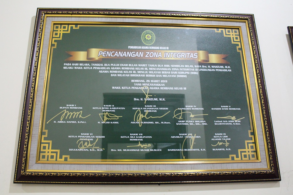 Pada tanggal 26 Maret 2019 Pengadilan Agama Rembang telah menyelenggarakan Deklarasi Pencanangan Pembangunan Zona Integritas Menuju Wilayah Bebas Korupsi dan Wilayah Birokrasi Bersih dan Melayani, yang disaksikan juga oleh oleh Bupati Kabupaten Rembang beserta unsur forkompinda dan juga disaksikan oleh tokoh agama dan masyarakat. Deklarasi ini adalah sebuah komitmen dari Pengadilan Agama Rembang untuk benar-benar mewujudkan Pengadilan yang bebas korupsi, dengan birokrasi yang bersih dan melayani.