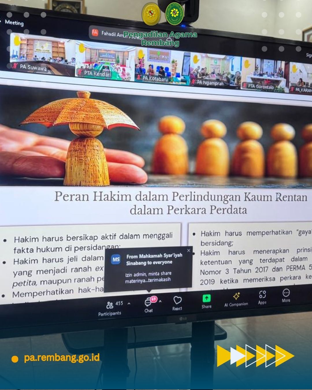 Rembang, 8 Agustus 2025 — Bertempat di Media Center Pengadilan Agama (PA) Rembang, seluruh aparatur teknis mengikuti secara daring Bimbingan Teknis (Bimtek) bertema “Pedoman Mengadili Perkara Kaum Rentan Berhadapan dengan Hukum dalam Perkara Perdata” yang diselenggarakan oleh Direktorat Jenderal Badan Peradilan Agama Mahkamah Agung RI.