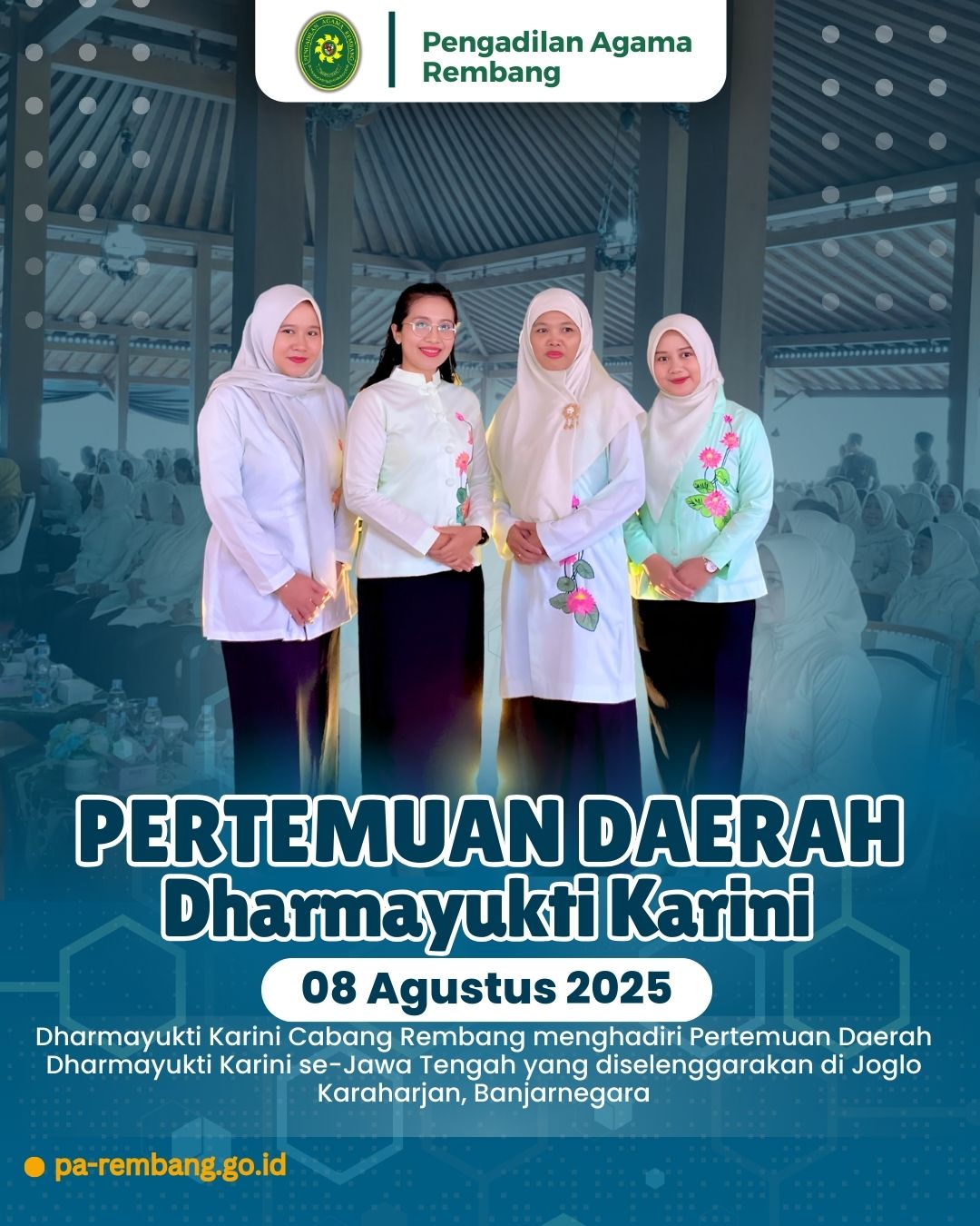 Rembang, 8 Agustus 2025 — Dharmayukti Karini Cabang Rembang menghadiri Pertemuan Daerah Dharmayukti Karini se-Jawa Tengah yang bertempat di Joglo Karaharjan, Banjarnegara. Kegiatan ini menjadi ajang silaturahmi, koordinasi, sekaligus pembinaan bagi seluruh cabang se-Jawa Tengah.