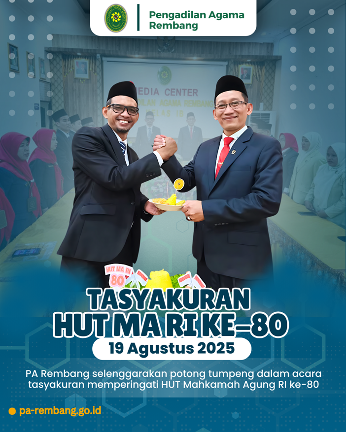 Pengadilan Agama (PA) Rembang menggelar acara tasyakuran yang penuh kehangatan sebagai bagian dari peringatan Hari Ulang Tahun (HUT) ke-80 Mahkamah Agung (MA) Republik Indonesia. Bertempat di Aula PA Rembang pada Selasa (19/08), acara ini menjadi momen refleksi dan ungkapan rasa syukur atas perjalanan panjang lembaga peradilan tertinggi di Indonesia.