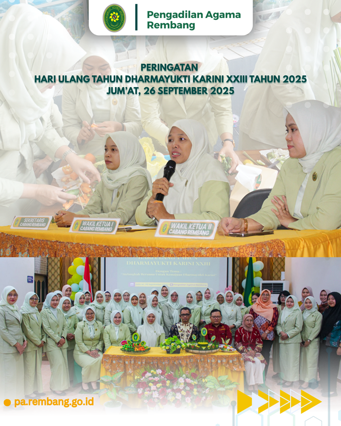 Rembang, 26 September 2025 — Dharmayukti Karini Cabang Rembang menyelenggarakan peringatan Hari Ulang Tahun ke-23 di Aula Pengadilan Agama Rembang dengan penuh khidmat dan suasana kekeluargaan. Rangkaian acara dimulai dengan pembukaan resmi, menyanyikan Lagu Kebangsaan Indonesia Raya serta Mars Dharmayukti Karini. Ketua Cabang Rembang dalam sambutannya menyampaikan harapan agar Dharmayukti Karini semakin berdaya guna bagi anggota dan masyarakat luas.