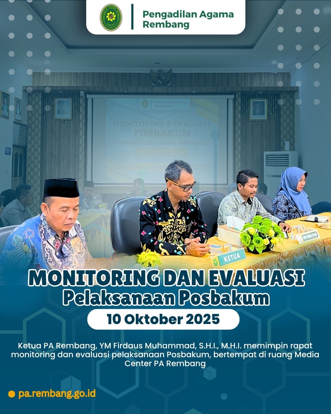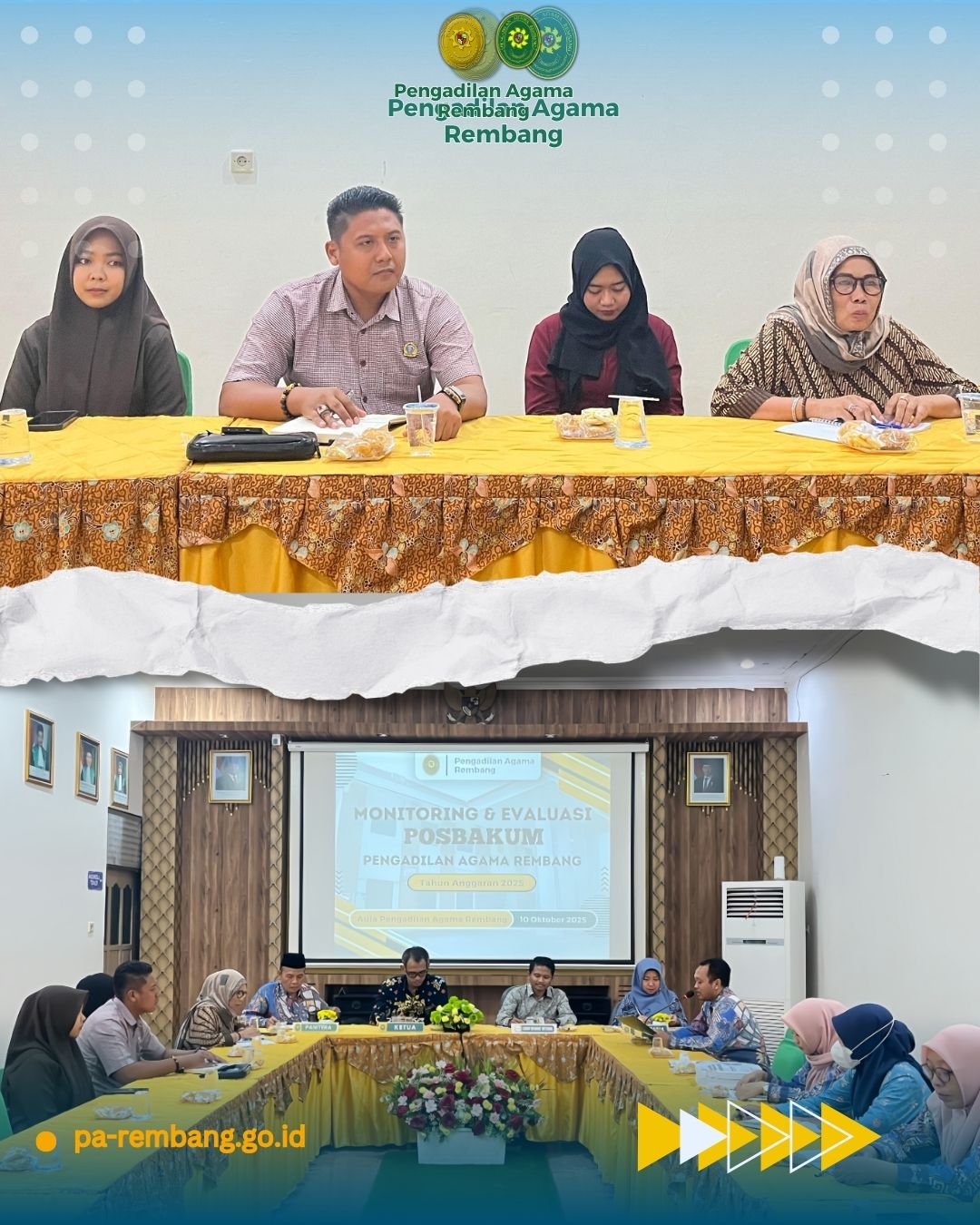 Rembang, 10 Oktober 2025 – Pengadilan Agama (PA) Rembang melaksanakan kegiatan Monitoring dan Evaluasi (Monev) terhadap kinerja Pos Bantuan Hukum (Posbakum) Tahun Anggaran 2025, bertempat di Ruang Media Center PA Rembang. Kegiatan ini dipimpin langsung oleh Ketua PA Rembang, Firdaus Muhammad, S.H.I., M.H.I., dan diikuti oleh Wakil Ketua, para Hakim, Panitera, Sekretaris, para Panitera Muda, Pejabat Pembuat Komitmen (PPK), serta tim LKBH Rumah Setara selaku pelaksana layanan Posbakum.