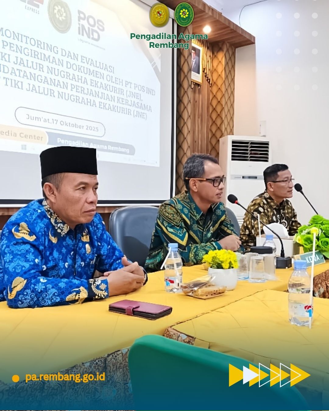Rembang, 17 Oktober 2025 – Pengadilan Agama (PA) Rembang melaksanakan kegiatan Monitoring dan Evaluasi (Monev) bersama PT Pos Indonesia dan PT Tiki Jalur Nugraha Ekakurir (JNE) pada Jumat (17/10), bertempat di Ruang Media Center PA Rembang. Kegiatan ini bertujuan memperkuat sinergi dalam optimalisasi layanan pengiriman surat tercatat guna mendukung efektivitas pelayanan peradilan kepada masyarakat. Rapat dipimpin oleh Ketua PA Rembang, Firdaus Muhammad, S.H.I., M.H.I., dan dihadiri oleh para hakim, panitera, pejabat kepaniteraan, serta perwakilan dari PT Pos Indonesia dan PT JNE Cabang Rembang.